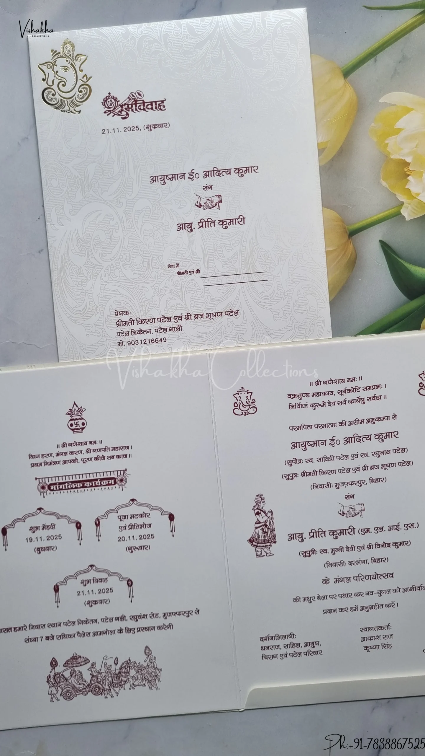 Vishakha Collections presents you beautiful luxury wedding invitation cards with all latest designs and the latest variety. Its just not a wedding invitation card but a beautiful feeling of love and relationship it carries for you. Beautifully printed and packed with a bundle of love. if you like it, dont think again, just go for it.If you are worrying about the quality of the product, send your doubts to us. We are here to help you. If you want in wholesale or bulk, dont forget to contact us.