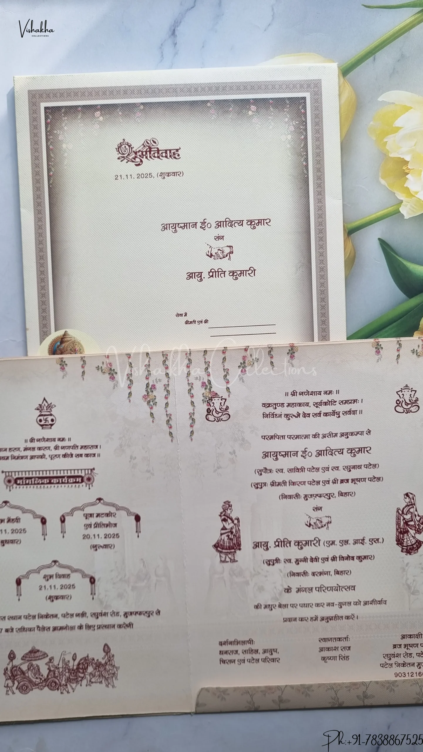 Vishakha Collections presents you beautiful luxury wedding invitation cards with all latest designs and the latest variety. Its just not a wedding invitation card but a beautiful feeling of love and relationship it carries for you. Beautifully printed and packed with a bundle of love. if you like it, dont think again, just go for it.If you are worrying about the quality of the product, send your doubts to us. We are here to help you. If you want in wholesale or bulk, dont forget to contact us.
