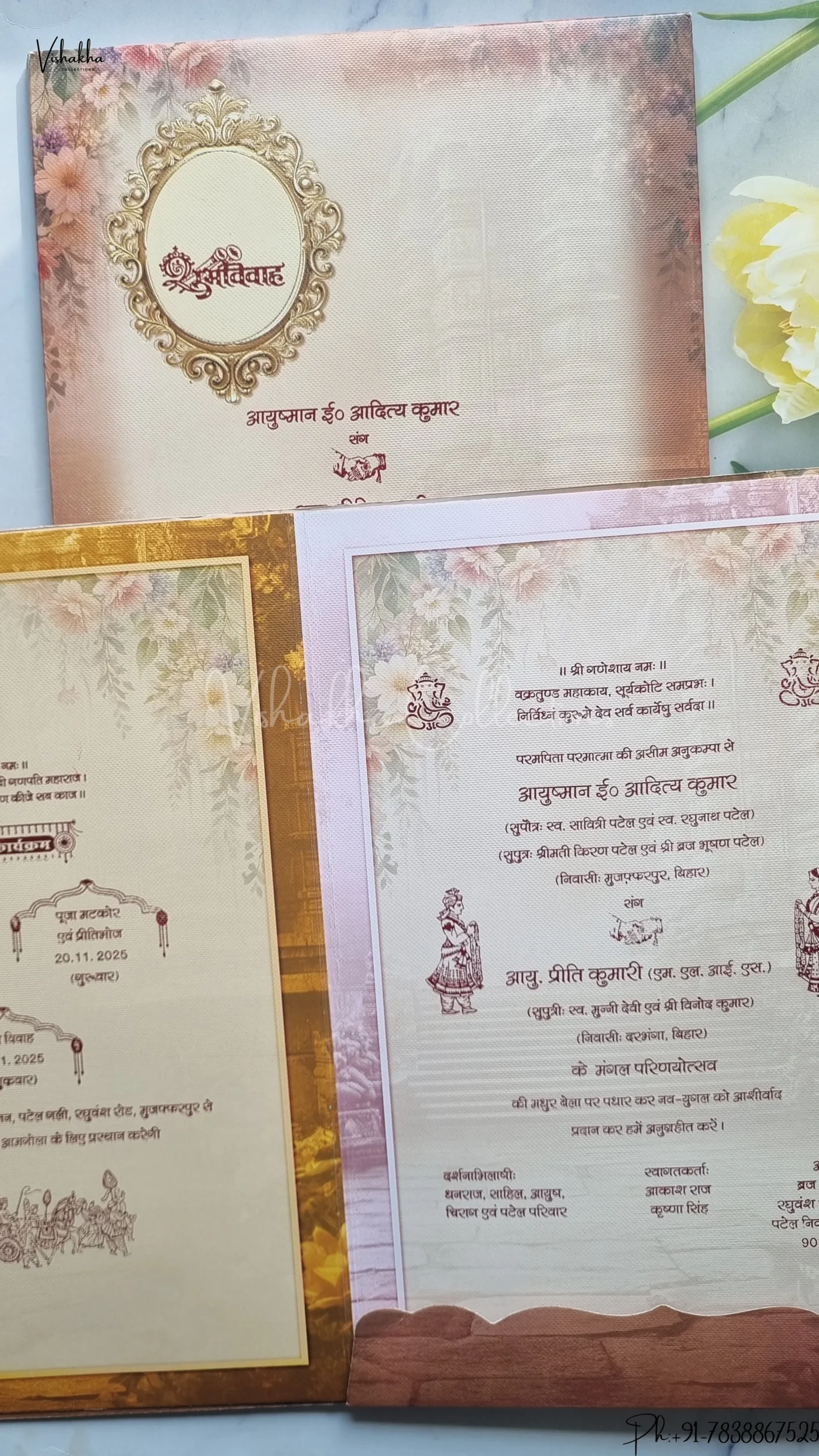 Vishakha Collections presents you beautiful luxury wedding invitation cards with all latest designs and the latest variety. Its just not a wedding invitation card but a beautiful feeling of love and relationship it carries for you. Beautifully printed and packed with a bundle of love. if you like it, dont think again, just go for it.If you are worrying about the quality of the product, send your doubts to us. We are here to help you. If you want in wholesale or bulk, dont forget to contact us.