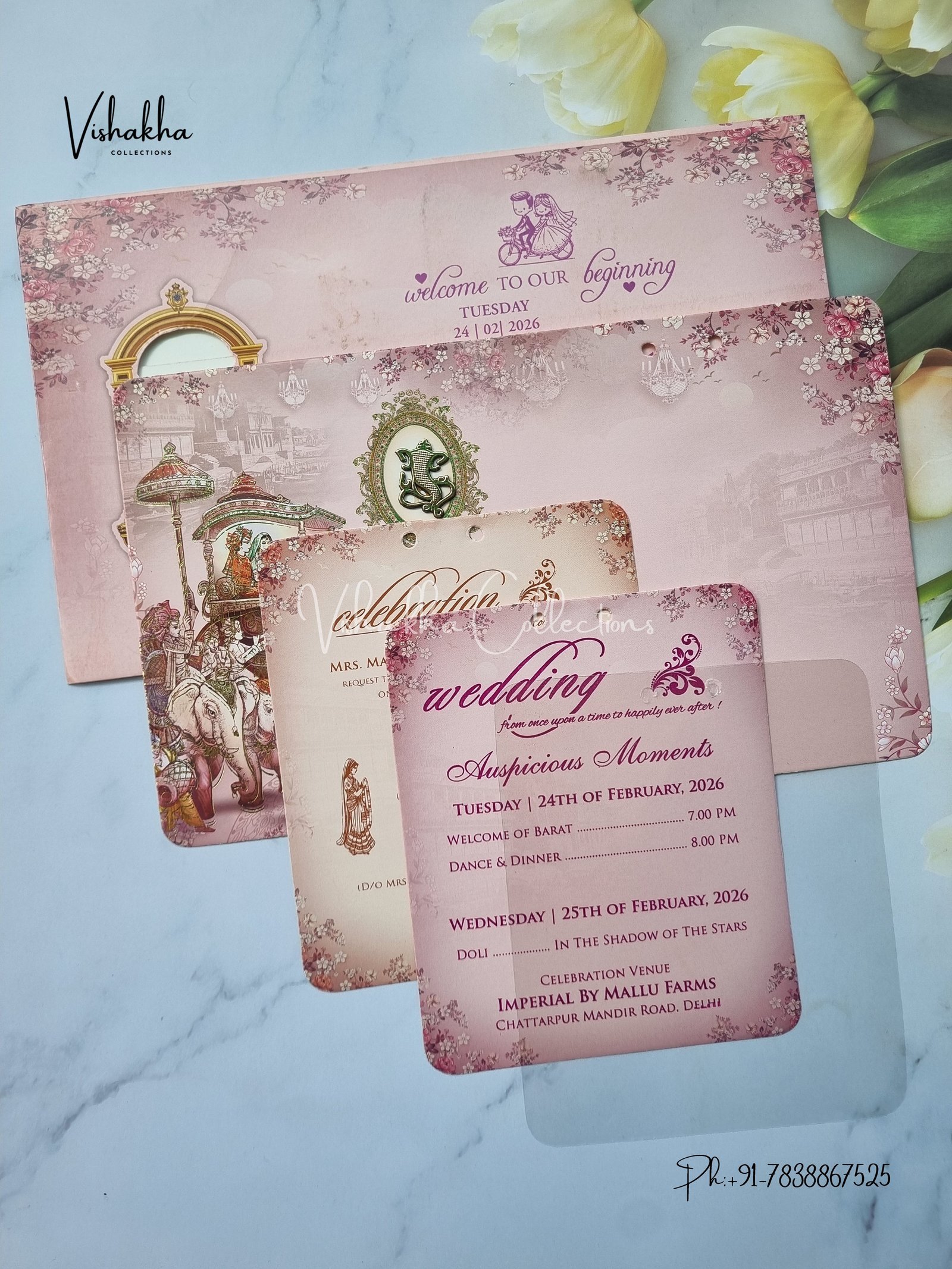 Vishakha Collections presents you beautiful luxury wedding invitation cards with all latest designs and the latest variety. Its just not a wedding invitation card but a beautiful feeling of love and relationship it carries for you. Beautifully printed and packed with a bundle of love. if you like it, dont think again, just go for it.If you are worrying about the quality of the product, send your doubts to us. We are here to help you. If you want in wholesale or bulk, dont forget to contact us.