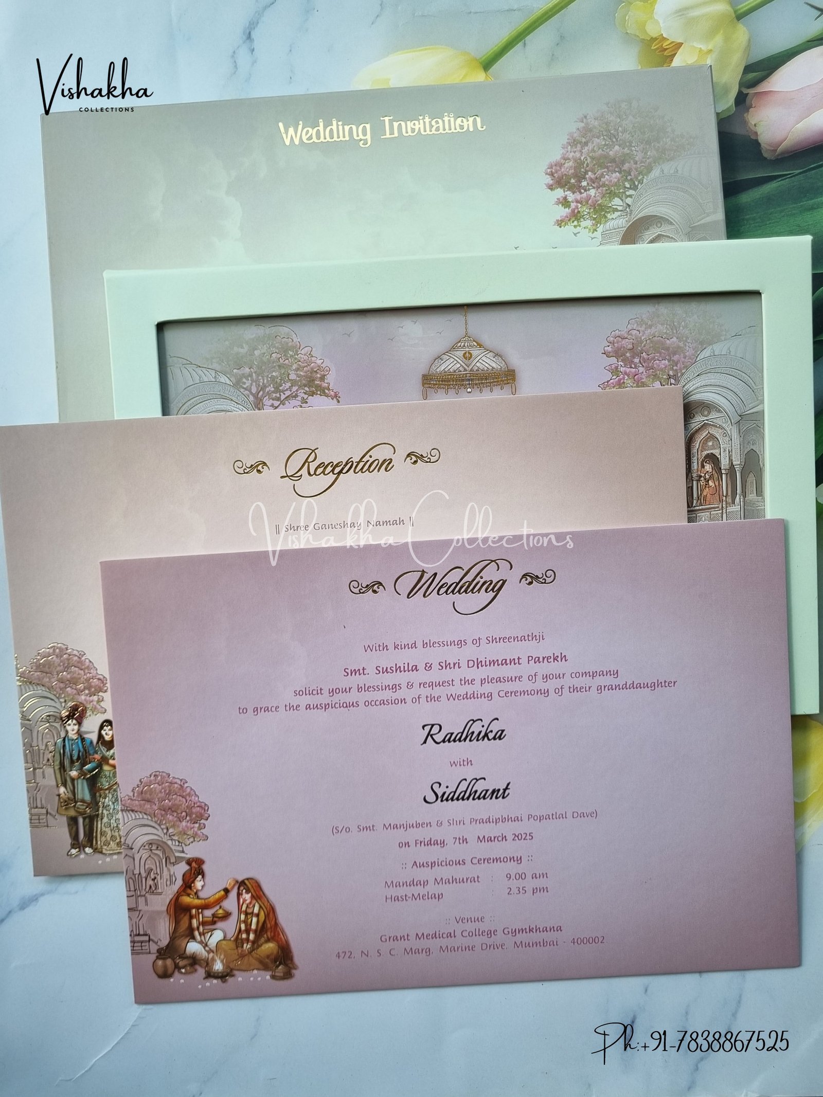 Vishakha Collections presents you beautiful luxury wedding invitation cards with all latest designs and the latest variety. Its just not a wedding invitation card but a beautiful feeling of love and relationship it carries for you. Beautifully printed and packed with a bundle of love. if you like it, dont think again, just go for it.If you are worrying about the quality of the product, send your doubts to us. We are here to help you. If you want in wholesale or bulk, dont forget to contact us.