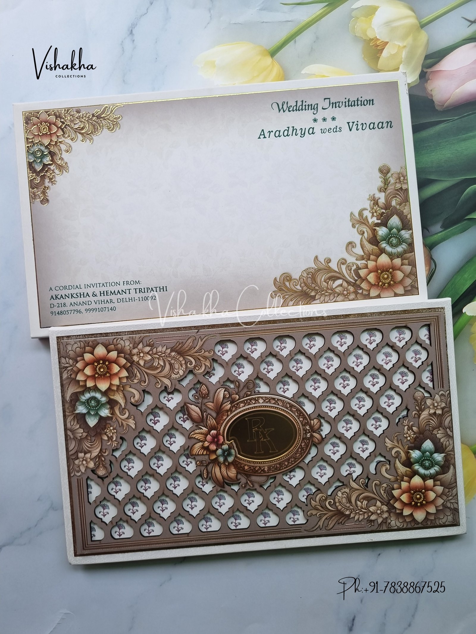 Vishakha Collections presents you a beautiful Barat Semi Box Flower Padded Laser Cut With Emblem Invitation Cards EJ-418 with all latest designs and the latest variety. It’s just not a wedding invitation card but a beautiful feeling of love and relationship it carries for you. Beautifully printed and packed with a bundle of love. if you like it, don’t think again, just go for it. If you are worried about the quality of the product, please let us know your doubts. We are here to help you. If you want in wholesale or bulk, don’t forget to contact us.