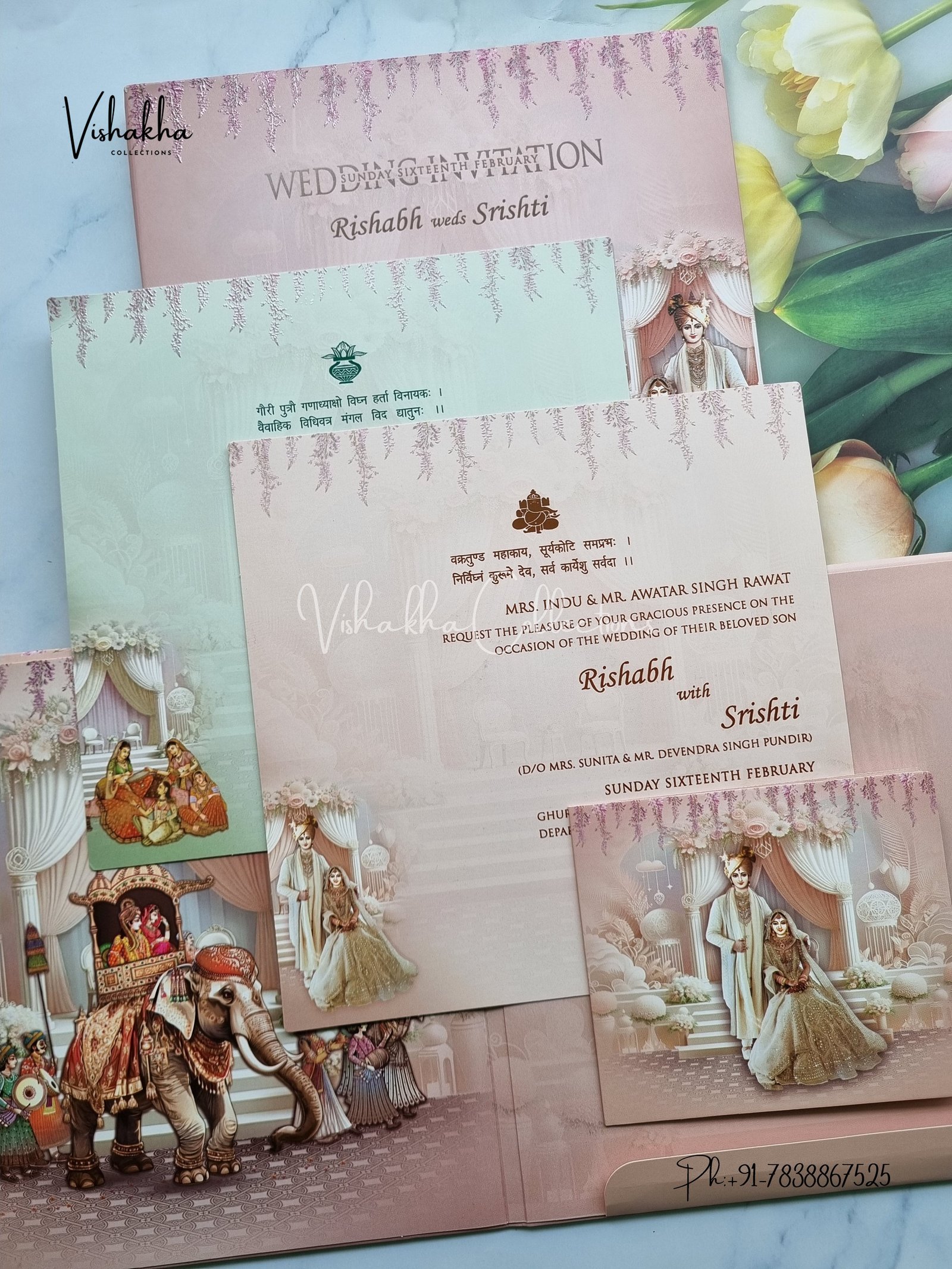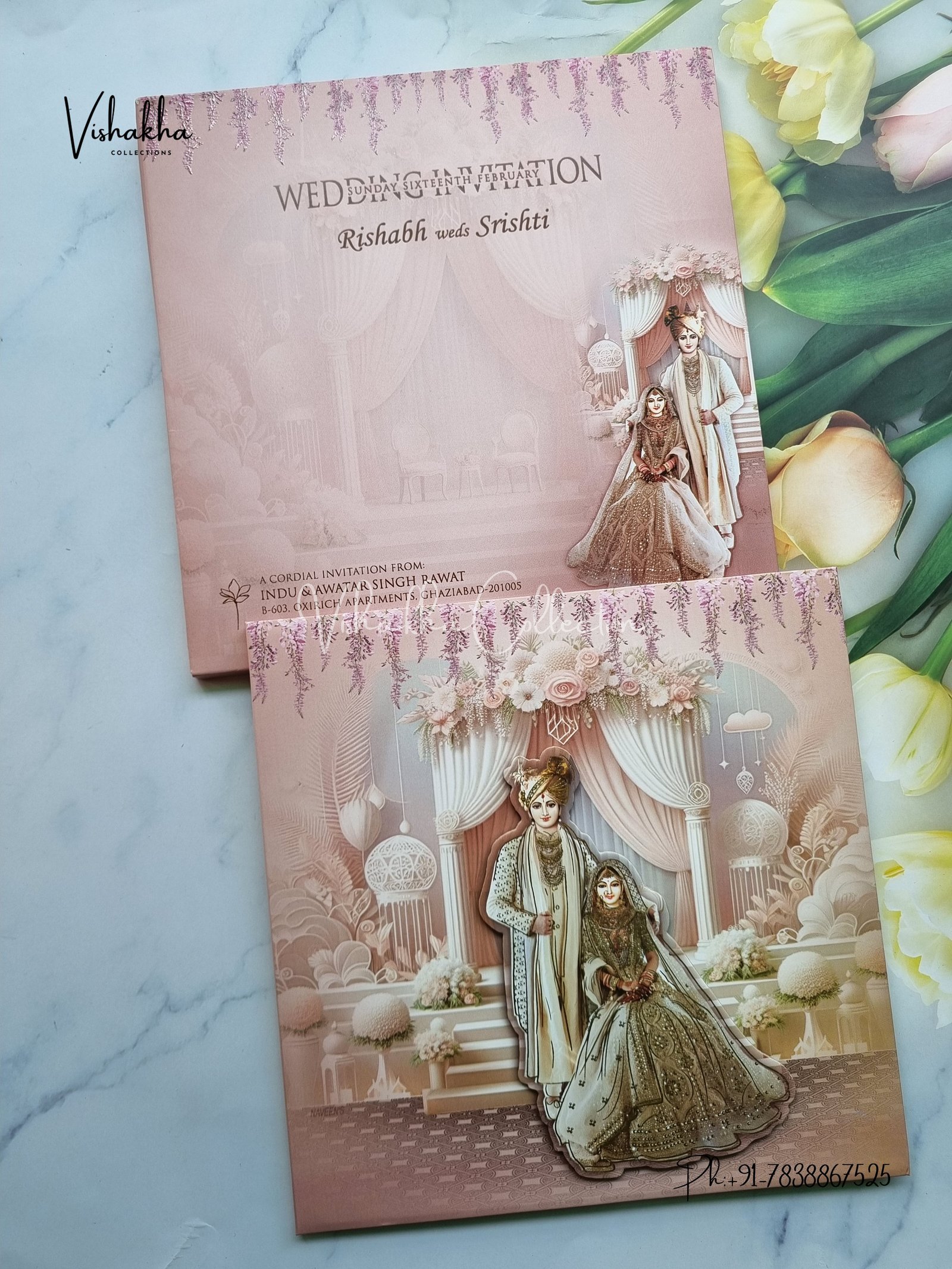 Vishakha Collections presents you beautiful luxury wedding invitation cards with all latest designs and the latest variety. Its just not a wedding invitation card but a beautiful feeling of love and relationship it carries for you. Beautifully printed and packed with a bundle of love. if you like it, dont think again, just go for it.If you are worrying about the quality of the product, send your doubts to us. We are here to help you. If you want in wholesale or bulk, dont forget to contact us.