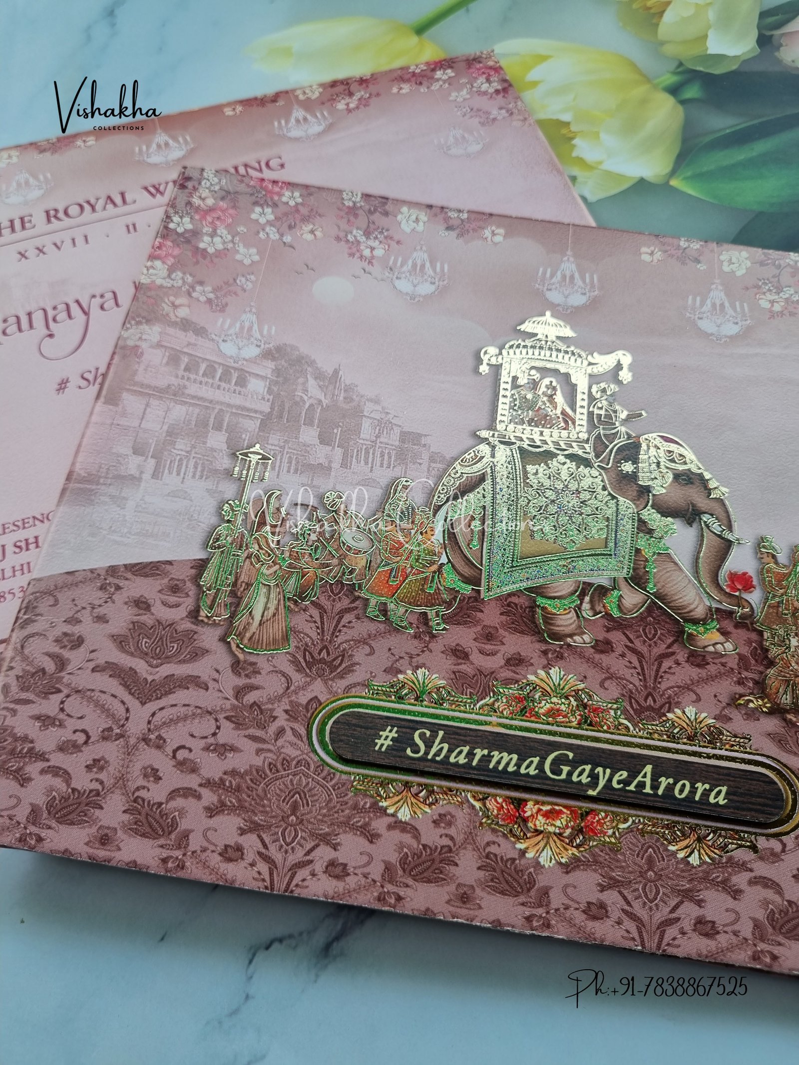 Vishakha Collections presents you beautiful luxury wedding invitation cards with all latest designs and the latest variety. Its just not a wedding invitation card but a beautiful feeling of love and relationship it carries for you. Beautifully printed and packed with a bundle of love. if you like it, dont think again, just go for it.If you are worrying about the quality of the product, send your doubts to us. We are here to help you. If you want in wholesale or bulk, dont forget to contact us.