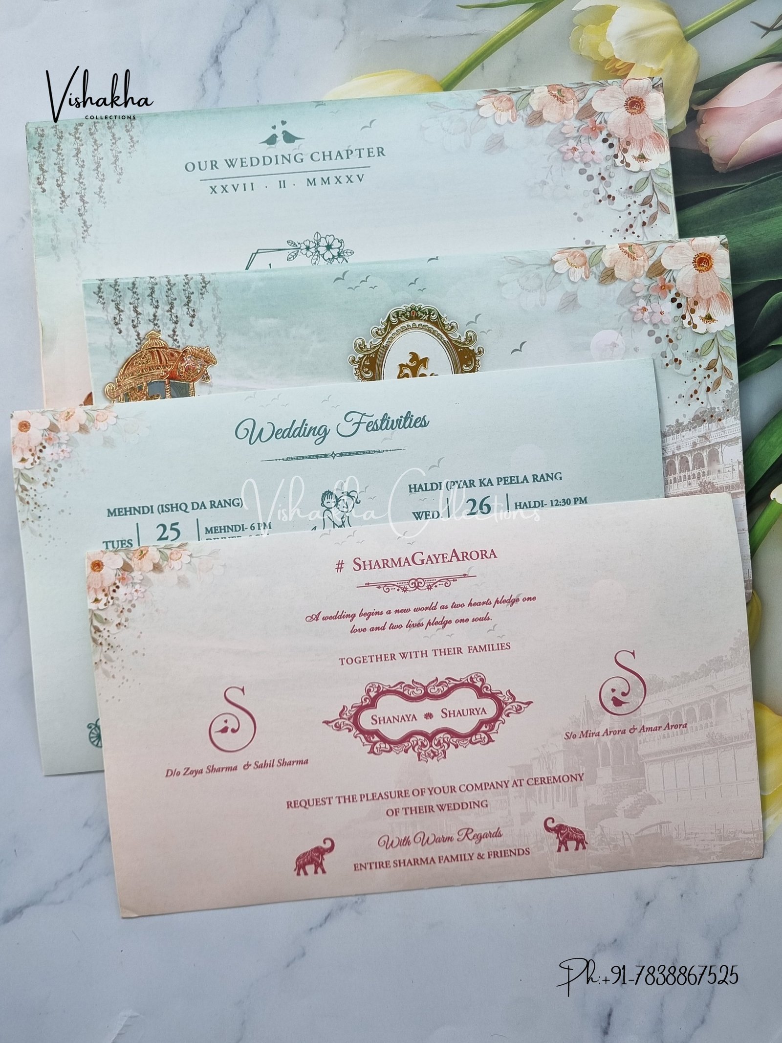 Vishakha Collections presents you beautiful luxury wedding invitation cards with all latest designs and the latest variety. Its just not a wedding invitation card but a beautiful feeling of love and relationship it carries for you. Beautifully printed and packed with a bundle of love. if you like it, dont think again, just go for it.If you are worrying about the quality of the product, send your doubts to us. We are here to help you. If you want in wholesale or bulk, dont forget to contact us.