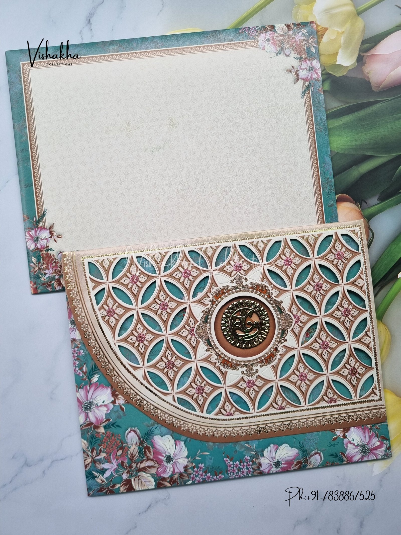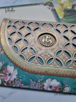 ₹50.00Bluish Green Geometrical pattern three fold type Floral wedding invite