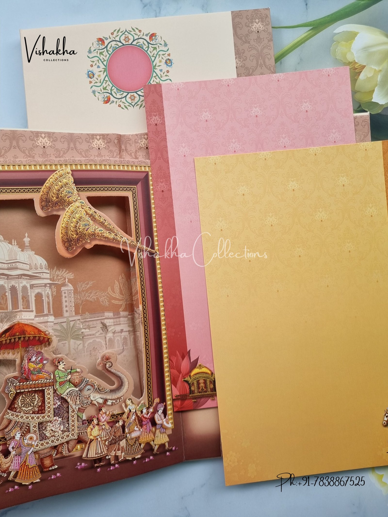 Vishakha Collections presents you beautiful luxury wedding invitation cards with all latest designs and the latest variety. Its just not a wedding invitation card but a beautiful feeling of love and relationship it carries for you. Beautifully printed and packed with a bundle of love. if you like it, dont think again, just go for it.If you are worrying about the quality of the product, send your doubts to us. We are here to help you. If you want in wholesale or bulk, dont forget to contact us.