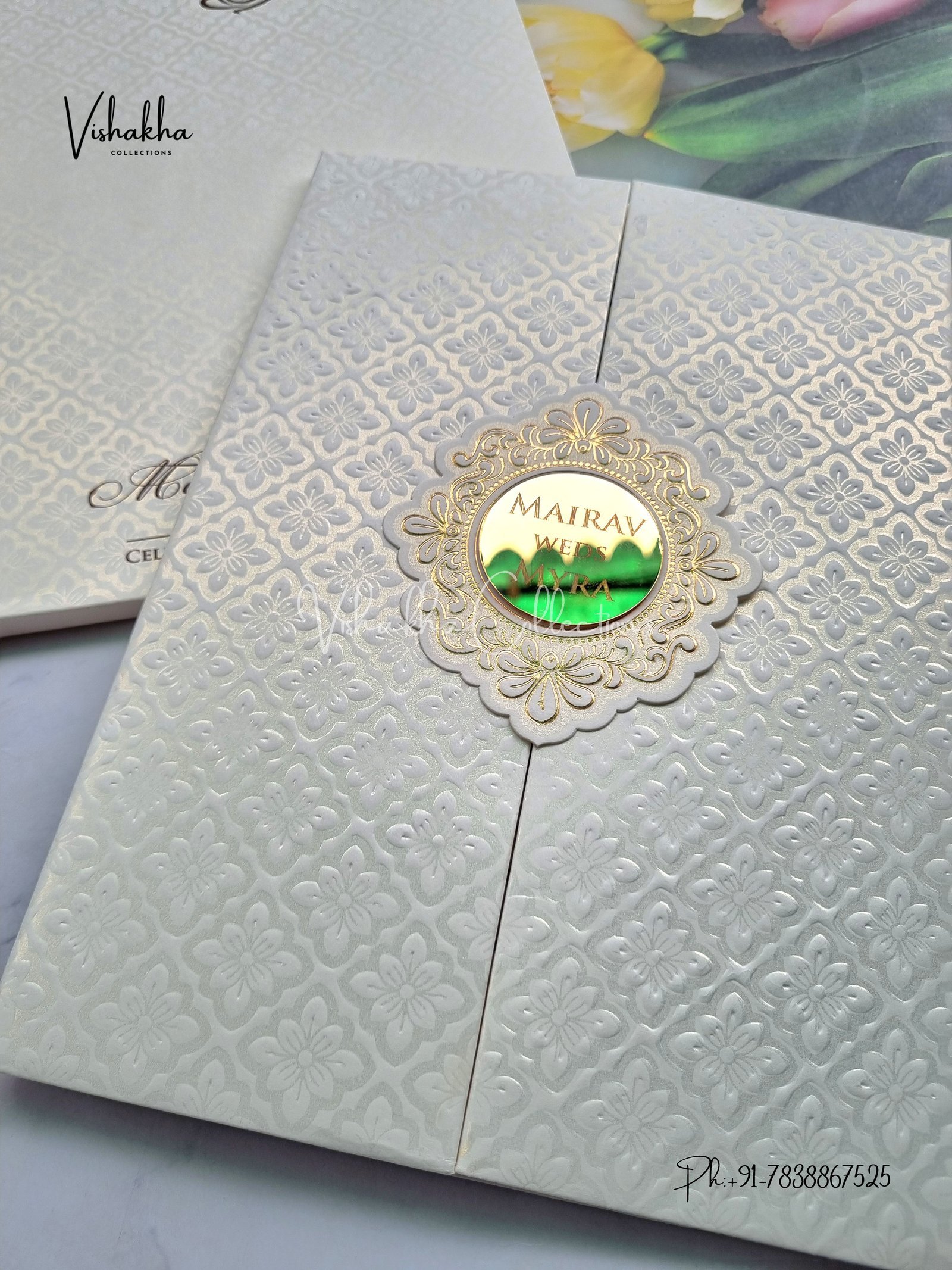 Cream colour Textured White Padded card with acrylic name plate Wedding Invitation Card SK-3428