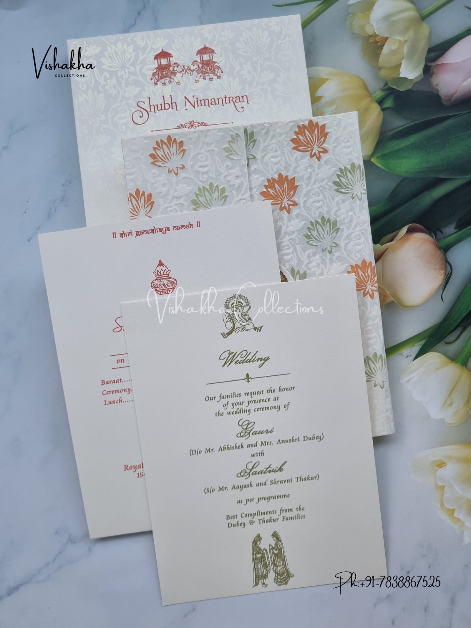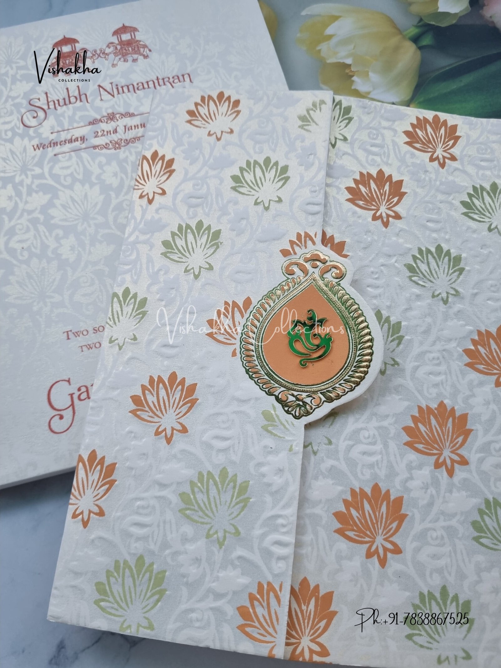 Vishakha Collections presents you beautiful luxury wedding invitation cards with all latest designs and the latest variety. Its just not a wedding invitation card but a beautiful feeling of love and relationship it carries for you. Beautifully printed and packed with a bundle of love. if you like it, dont think again, just go for it.If you are worrying about the quality of the product, send your doubts to us. We are here to help you. If you want in wholesale or bulk, dont forget to contact us.