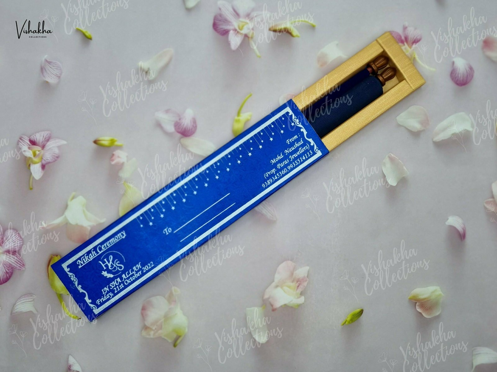 Vishakha Collections presents you beautiful luxury wedding invitation cards with all latest designs and the latest variety. Its just not a wedding invitation card but a beautiful feeling of love and relationship it carries for you. Beautifully printed and packed with a bundle of love. if you like it, dont think again, just go for it.If you are worrying about the quality of the product, send your doubts to us. We are here to help you. If you want in wholesale or bulk, dont forget to contact us.