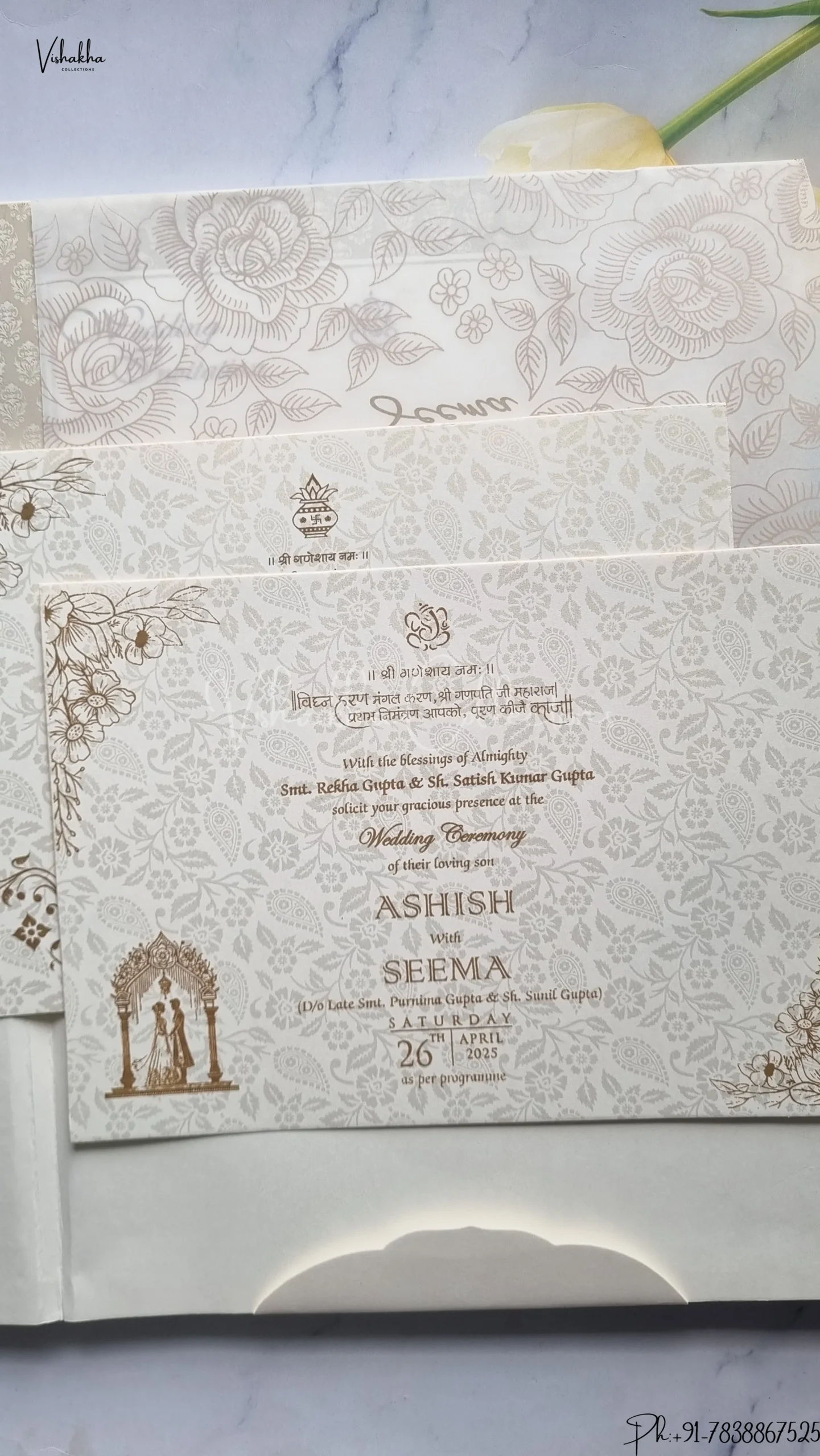 Vishakha Collections presents you beautiful luxury wedding invitation cards with all latest designs and the latest variety. Its just not a wedding invitation card but a beautiful feeling of love and relationship it carries for you. Beautifully printed and packed with a bundle of love. if you like it, dont think again, just go for it.If you are worrying about the quality of the product, send your doubts to us. We are here to help you. If you want in wholesale or bulk, dont forget to contact us.