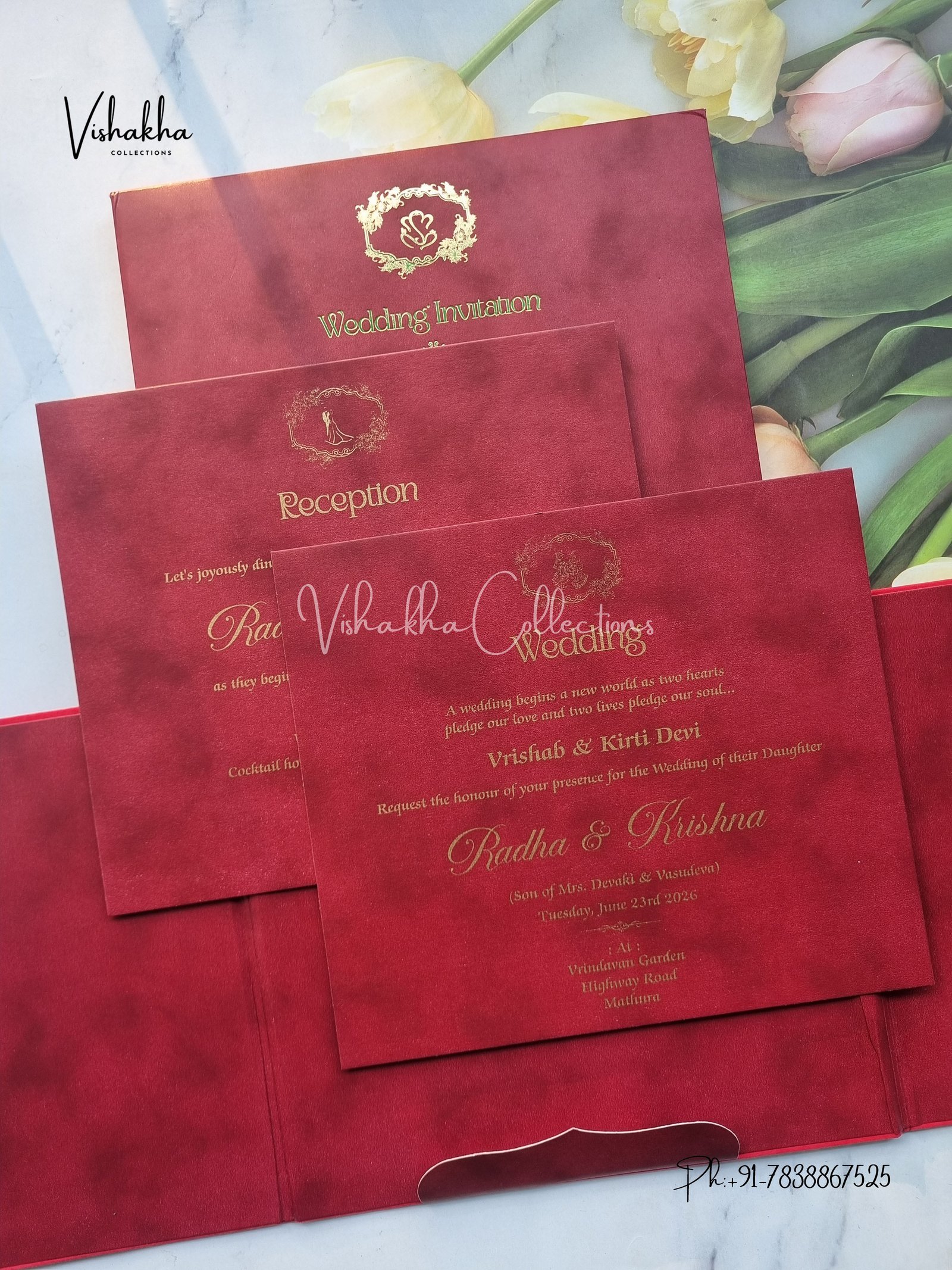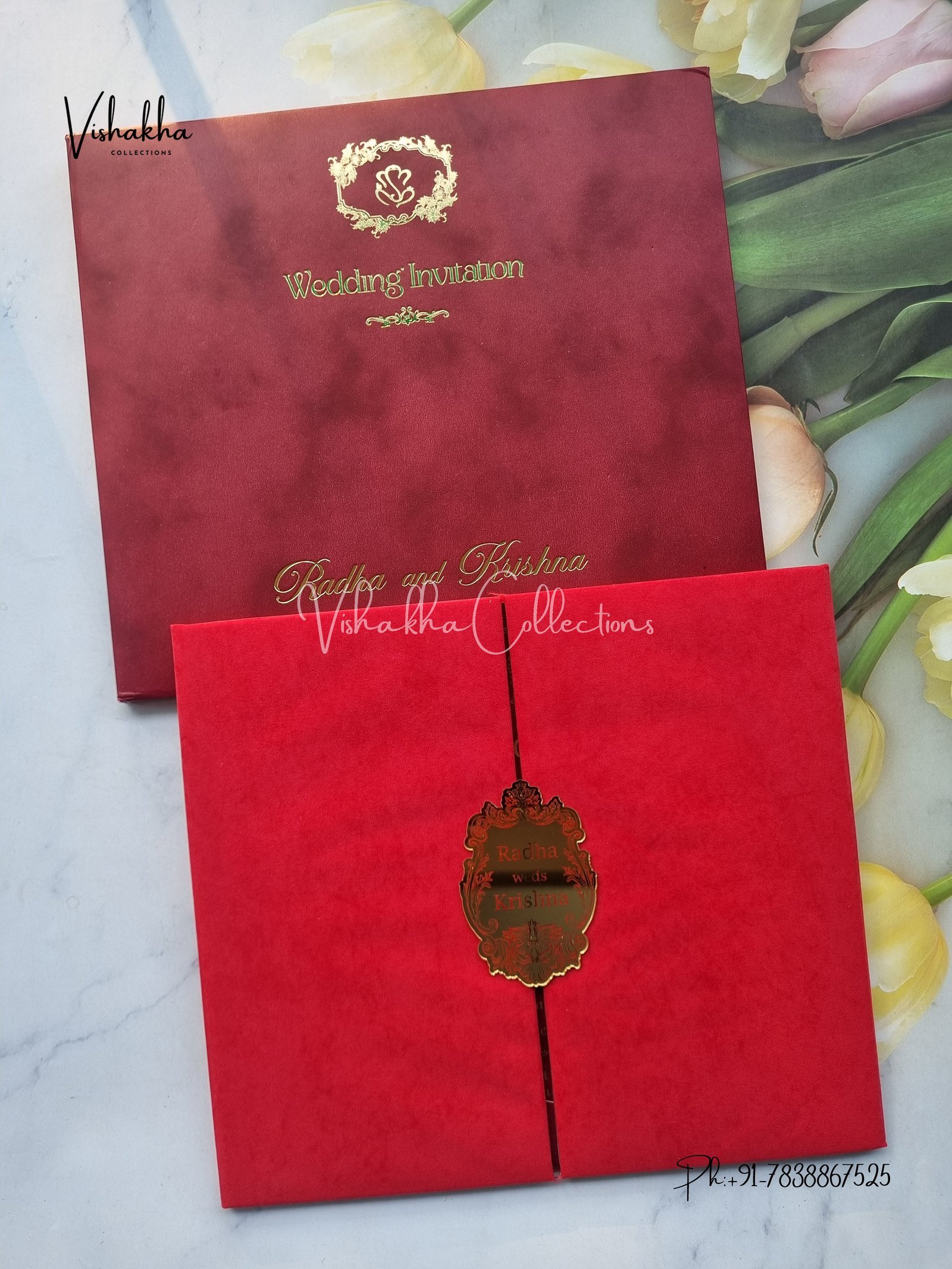 Vishakha Collections presents you beautiful luxury wedding invitation cards with all latest designs and the latest variety. Its just not a wedding invitation card but a beautiful feeling of love and relationship it carries for you. Beautifully printed and packed with a bundle of love. if you like it, dont think again, just go for it.If you are worrying about the quality of the product, send your doubts to us. We are here to help you. If you want in wholesale or bulk, dont forget to contact us.