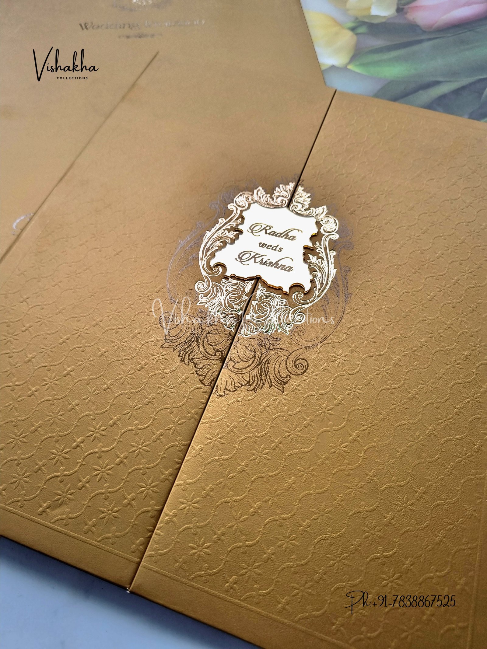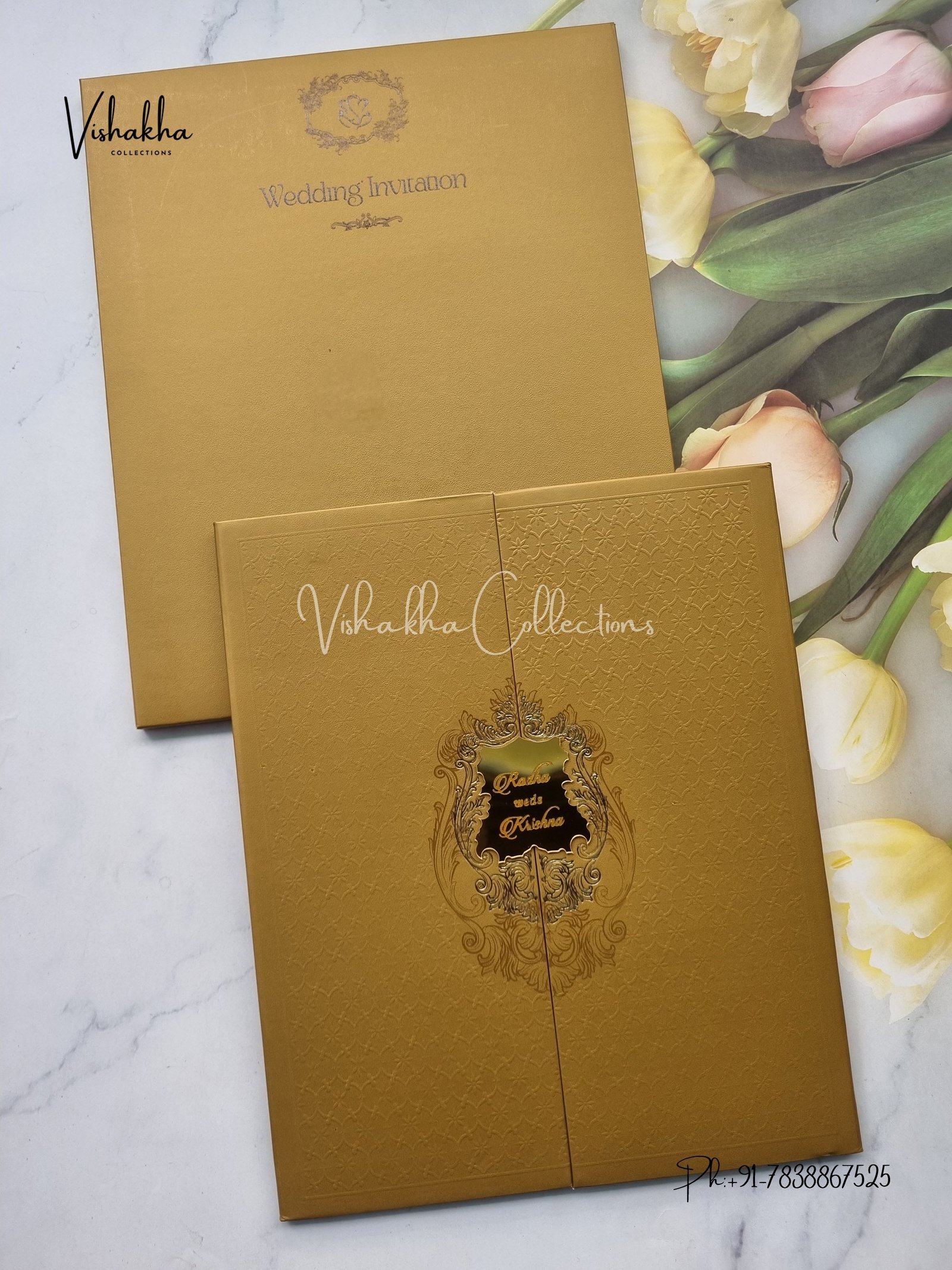 Vishakha Collections presents you beautiful luxury wedding invitation cards with all latest designs and the latest variety. Its just not a wedding invitation card but a beautiful feeling of love and relationship it carries for you. Beautifully printed and packed with a bundle of love. if you like it, dont think again, just go for it.If you are worrying about the quality of the product, send your doubts to us. We are here to help you. If you want in wholesale or bulk, dont forget to contact us.