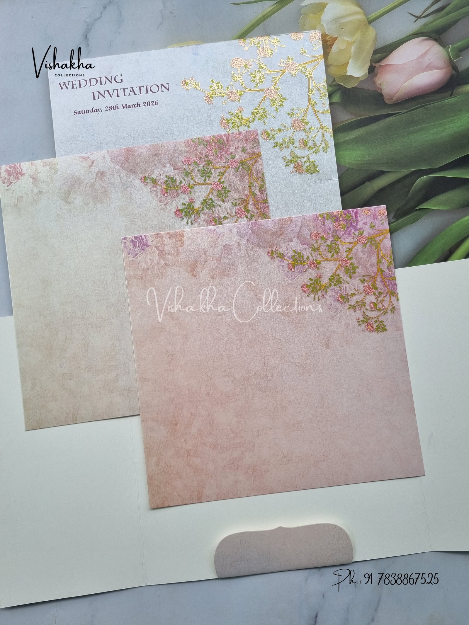 Vishakha Collections presents you beautiful luxury wedding invitation cards with all latest designs and the latest variety. Its just not a wedding invitation card but a beautiful feeling of love and relationship it carries for you. Beautifully printed and packed with a bundle of love. if you like it, dont think again, just go for it.If you are worrying about the quality of the product, send your doubts to us. We are here to help you. If you want in wholesale or bulk, dont forget to contact us.