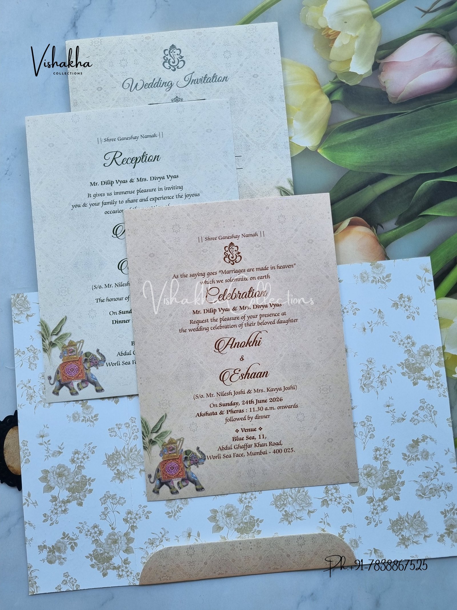 Vishakha Collections presents you beautiful luxury wedding invitation cards with all latest designs and the latest variety. Its just not a wedding invitation card but a beautiful feeling of love and relationship it carries for you. Beautifully printed and packed with a bundle of love. if you like it, dont think again, just go for it.If you are worrying about the quality of the product, send your doubts to us. We are here to help you. If you want in wholesale or bulk, dont forget to contact us.