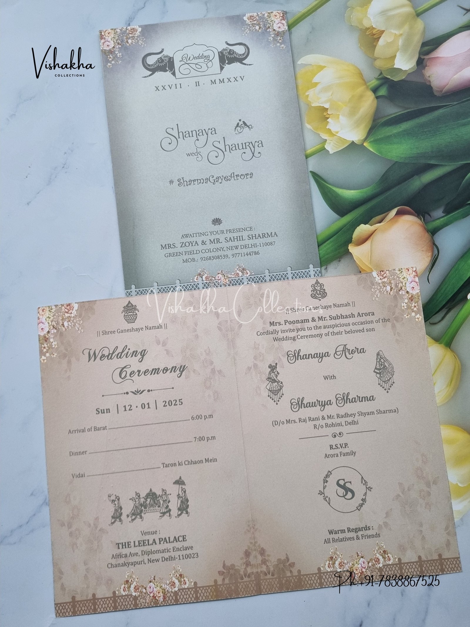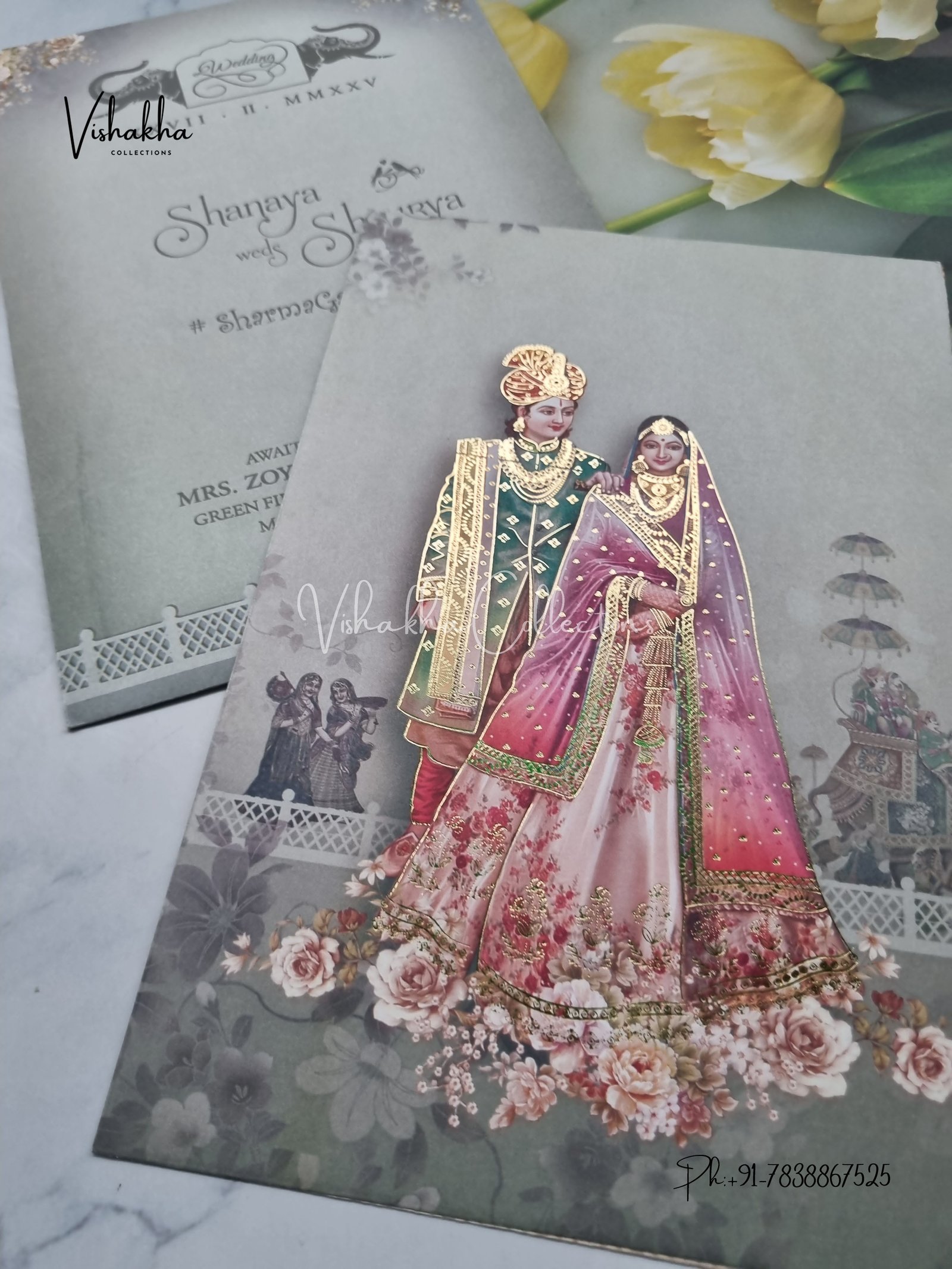Vishakha Collections presents you beautiful luxury wedding invitation cards with all latest designs and the latest variety. Its just not a wedding invitation card but a beautiful feeling of love and relationship it carries for you. Beautifully printed and packed with a bundle of love. if you like it, dont think again, just go for it.If you are worrying about the quality of the product, send your doubts to us. We are here to help you. If you want in wholesale or bulk, dont forget to contact us.