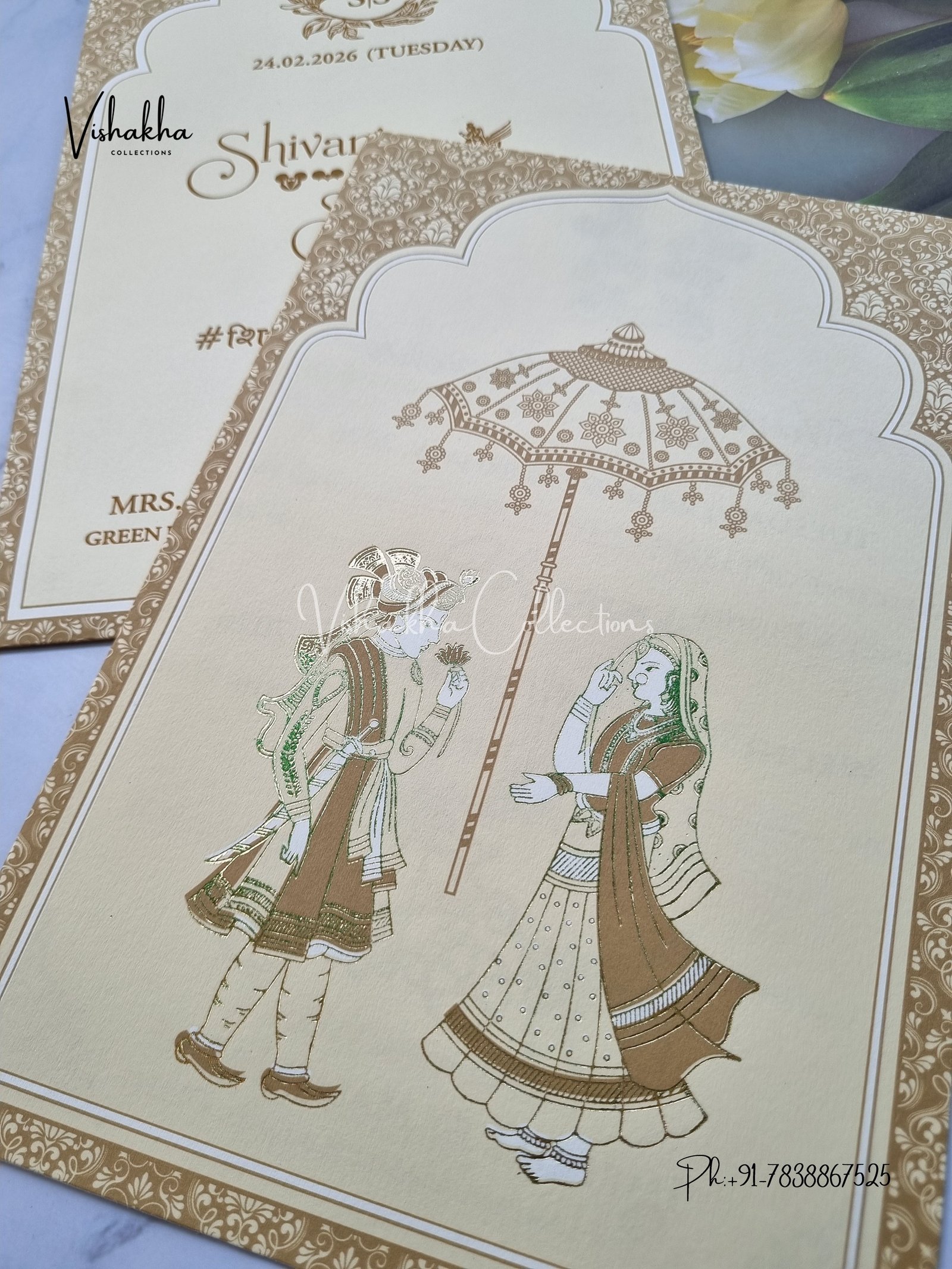 Vishakha Collections presents you beautiful luxury wedding invitation cards with all latest designs and the latest variety. Its just not a wedding invitation card but a beautiful feeling of love and relationship it carries for you. Beautifully printed and packed with a bundle of love. if you like it, dont think again, just go for it.If you are worrying about the quality of the product, send your doubts to us. We are here to help you. If you want in wholesale or bulk, dont forget to contact us.