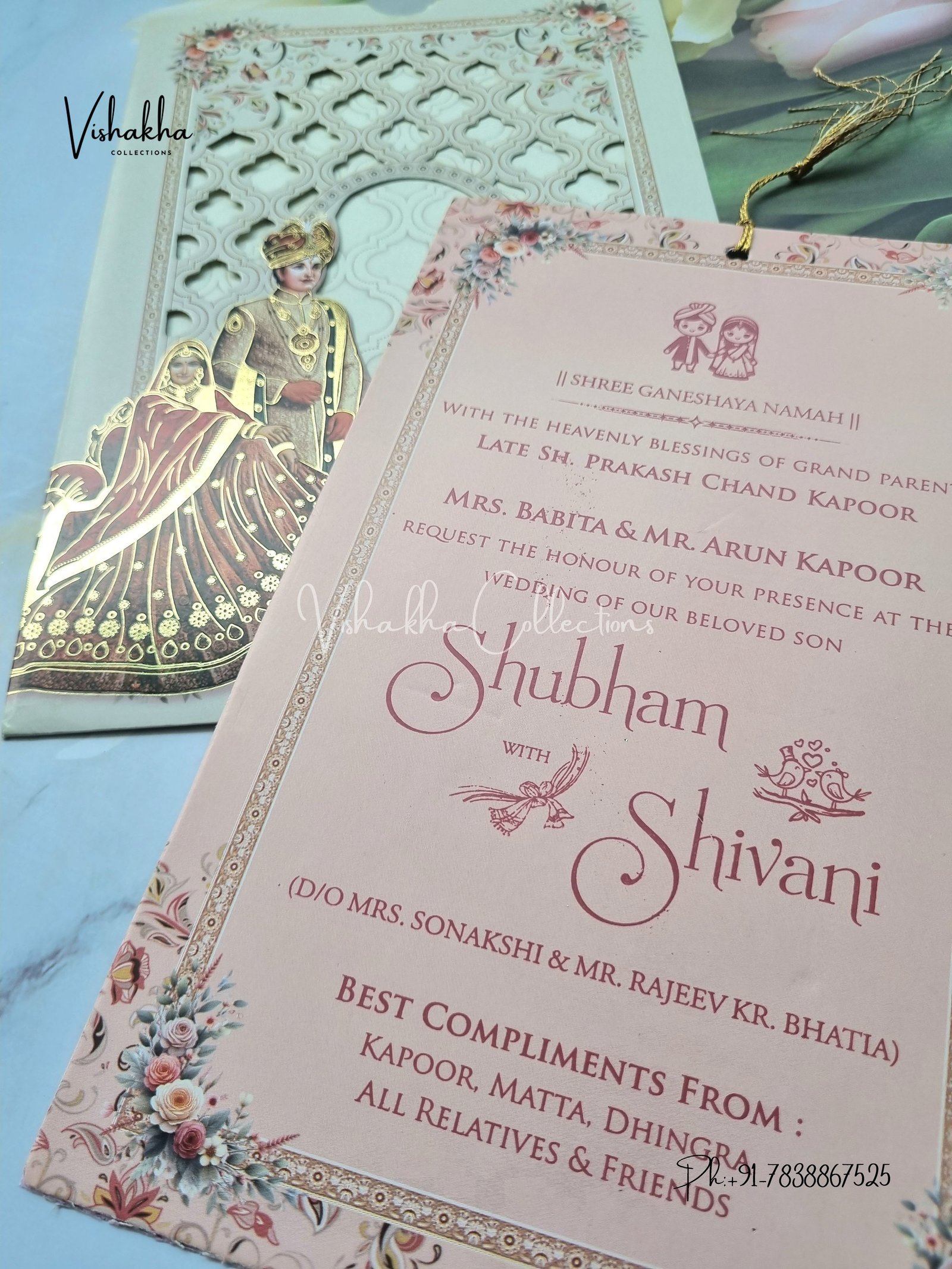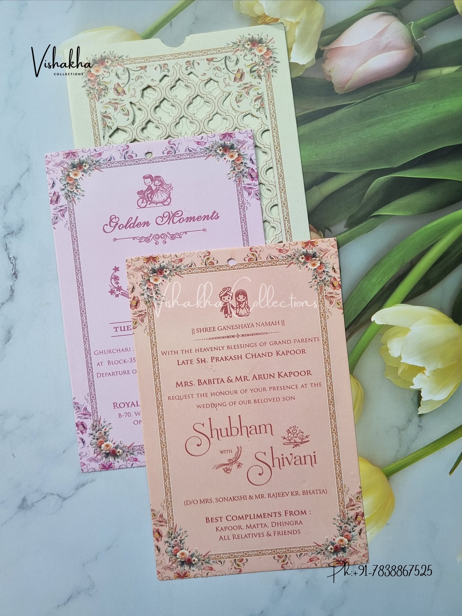 Vishakha Collections presents you beautiful luxury wedding invitation cards with all latest designs and the latest variety. Its just not a wedding invitation card but a beautiful feeling of love and relationship it carries for you. Beautifully printed and packed with a bundle of love. if you like it, dont think again, just go for it.If you are worrying about the quality of the product, send your doubts to us. We are here to help you. If you want in wholesale or bulk, dont forget to contact us.