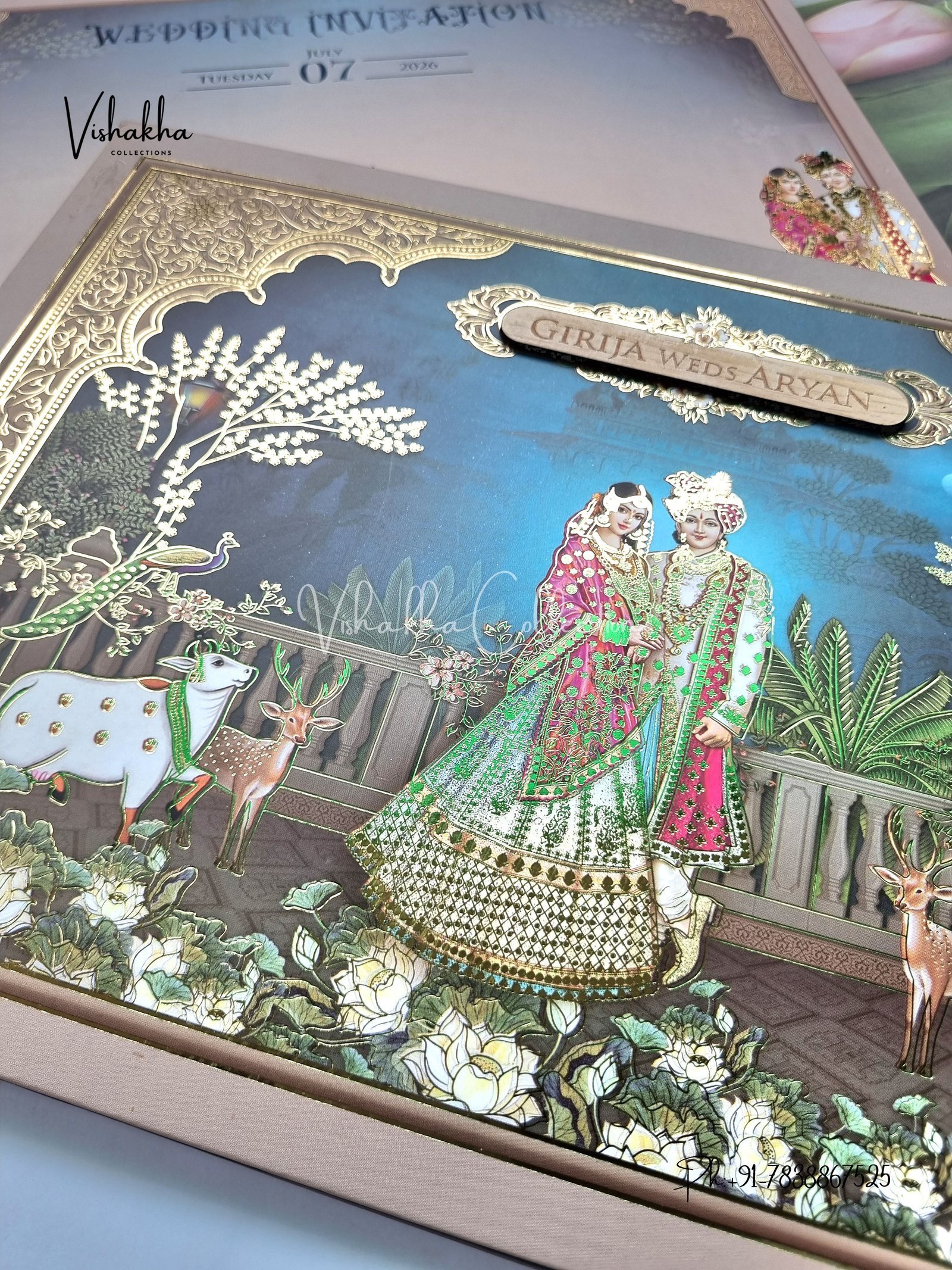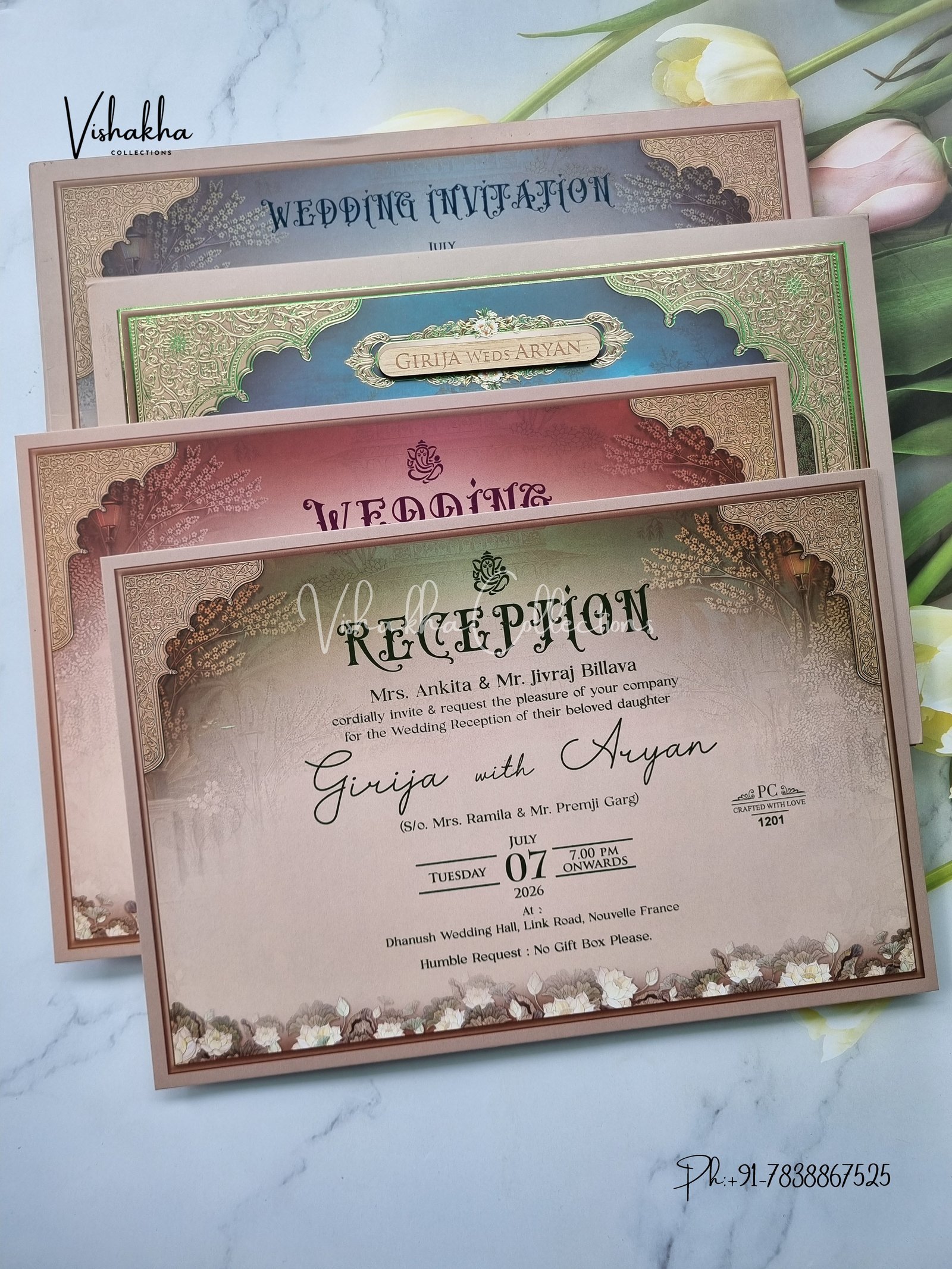 Vishakha Collections presents you beautiful luxury wedding invitation cards with all latest designs and the latest variety. Its just not a wedding invitation card but a beautiful feeling of love and relationship it carries for you. Beautifully printed and packed with a bundle of love. if you like it, dont think again, just go for it.If you are worrying about the quality of the product, send your doubts to us. We are here to help you. If you want in wholesale or bulk, dont forget to contact us.