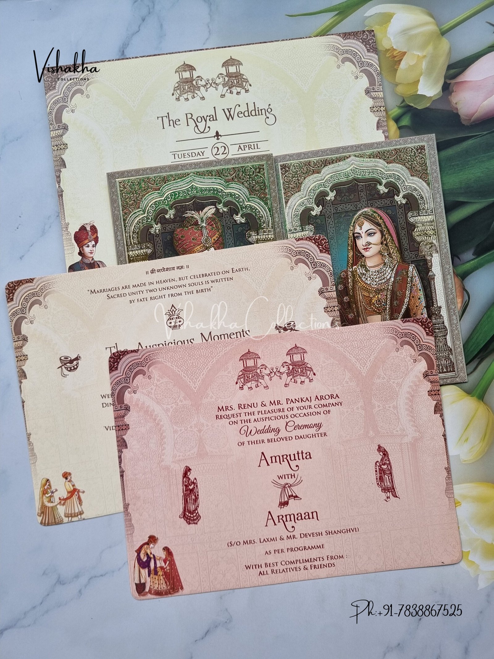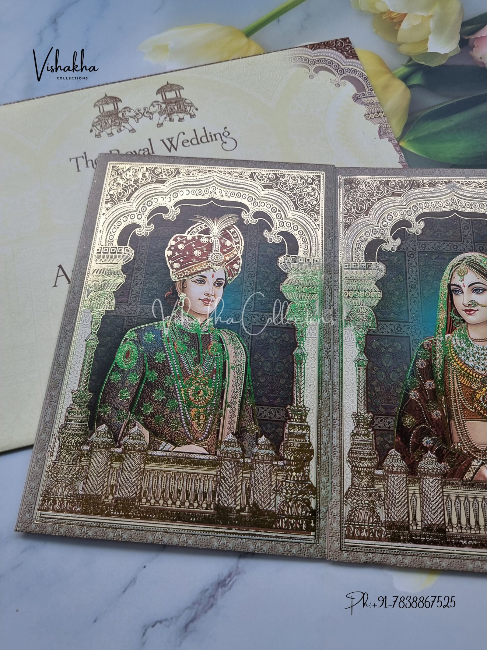 Vishakha Collections presents you beautiful luxury wedding invitation cards with all latest designs and the latest variety. Its just not a wedding invitation card but a beautiful feeling of love and relationship it carries for you. Beautifully printed and packed with a bundle of love. if you like it, dont think again, just go for it.If you are worrying about the quality of the product, send your doubts to us. We are here to help you. If you want in wholesale or bulk, dont forget to contact us.