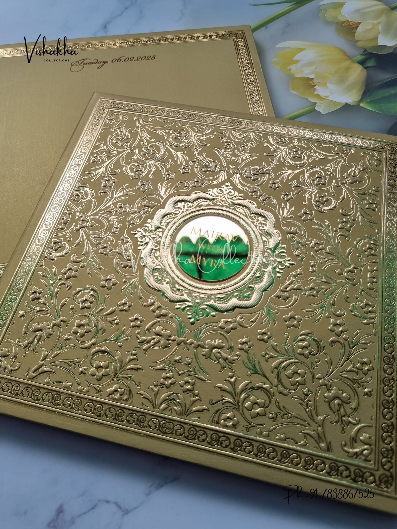 Vishakha Collections presents you beautiful luxury wedding invitation cards with all latest designs and the latest variety. Its just not a wedding invitation card but a beautiful feeling of love and relationship it carries for you. Beautifully printed and packed with a bundle of love. if you like it, dont think again, just go for it.If you are worrying about the quality of the product, send your doubts to us. We are here to help you. If you want in wholesale or bulk, dont forget to contact us.