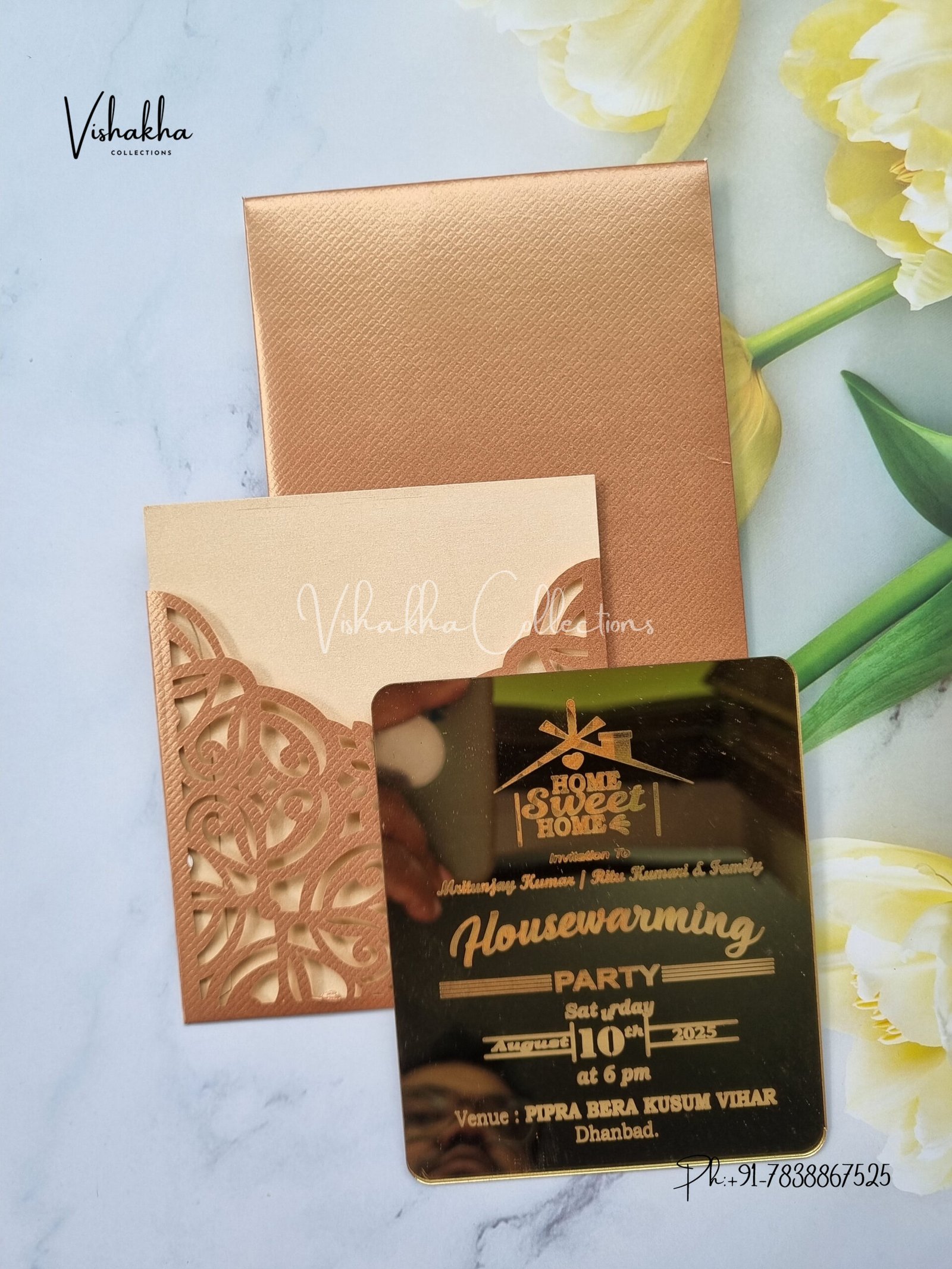 Vishakha Collections presents you beautiful luxury wedding invitation cards with all latest designs and the latest variety. Its just not a wedding invitation card but a beautiful feeling of love and relationship it carries for you. Beautifully printed and packed with a bundle of love. if you like it, dont think again, just go for it.If you are worrying about the quality of the product, send your doubts to us. We are here to help you. If you want in wholesale or bulk, dont forget to contact us.