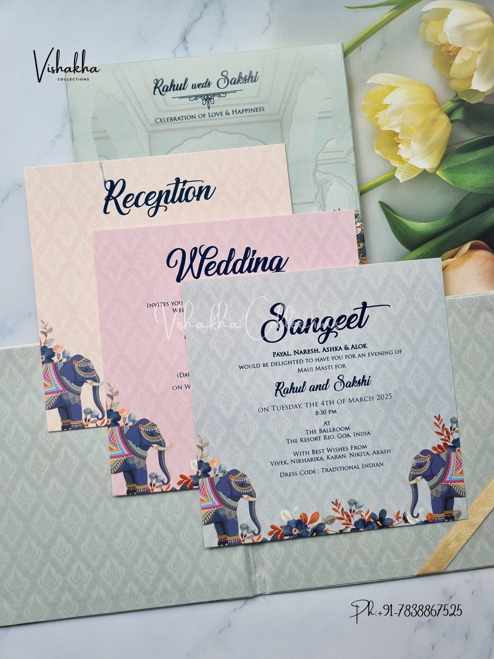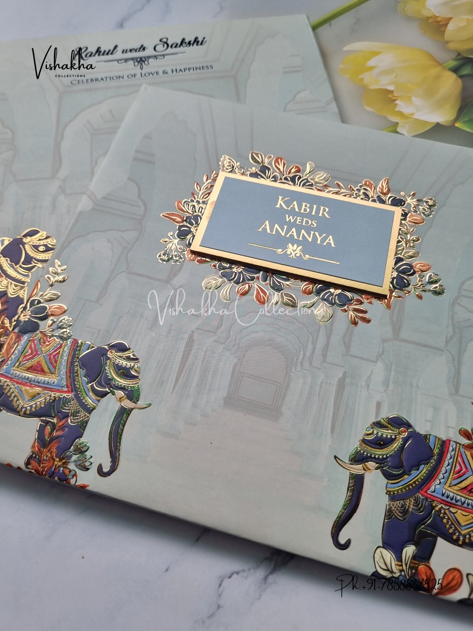 Vishakha Collections presents you beautiful luxury wedding invitation cards with all latest designs and the latest variety. Its just not a wedding invitation card but a beautiful feeling of love and relationship it carries for you. Beautifully printed and packed with a bundle of love. if you like it, dont think again, just go for it.If you are worrying about the quality of the product, send your doubts to us. We are here to help you. If you want in wholesale or bulk, dont forget to contact us.