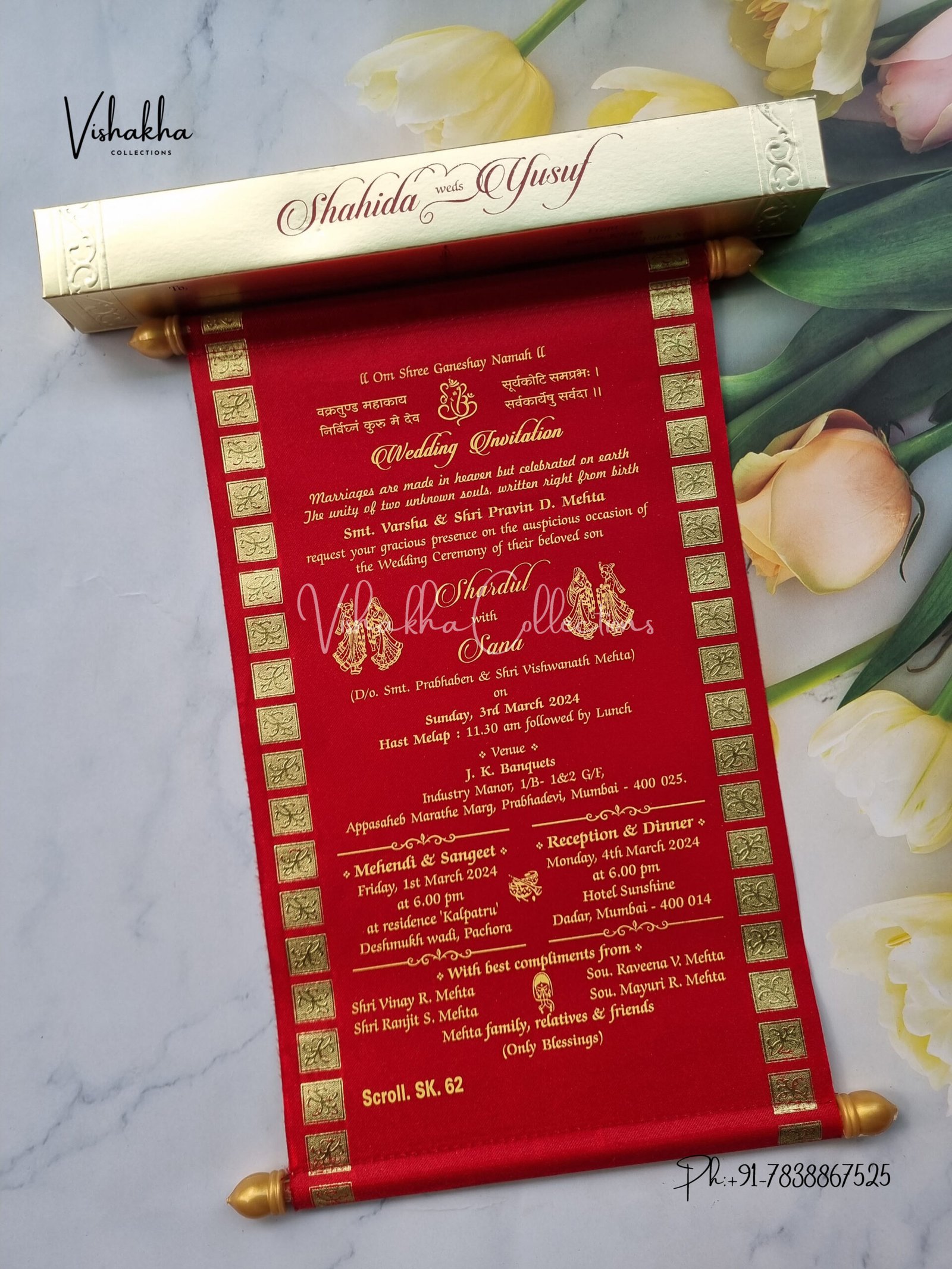 This box is used as the scroll invitation cover. It is made of scented metallic paper with golden foil design on both sides and inside it has a white tray in which the scroll is placed. The tray has to be made manually with the crease line given on the paper it will be provided in flat condition(unfold) . The top scented box will come pasted and it can be printed front and back.