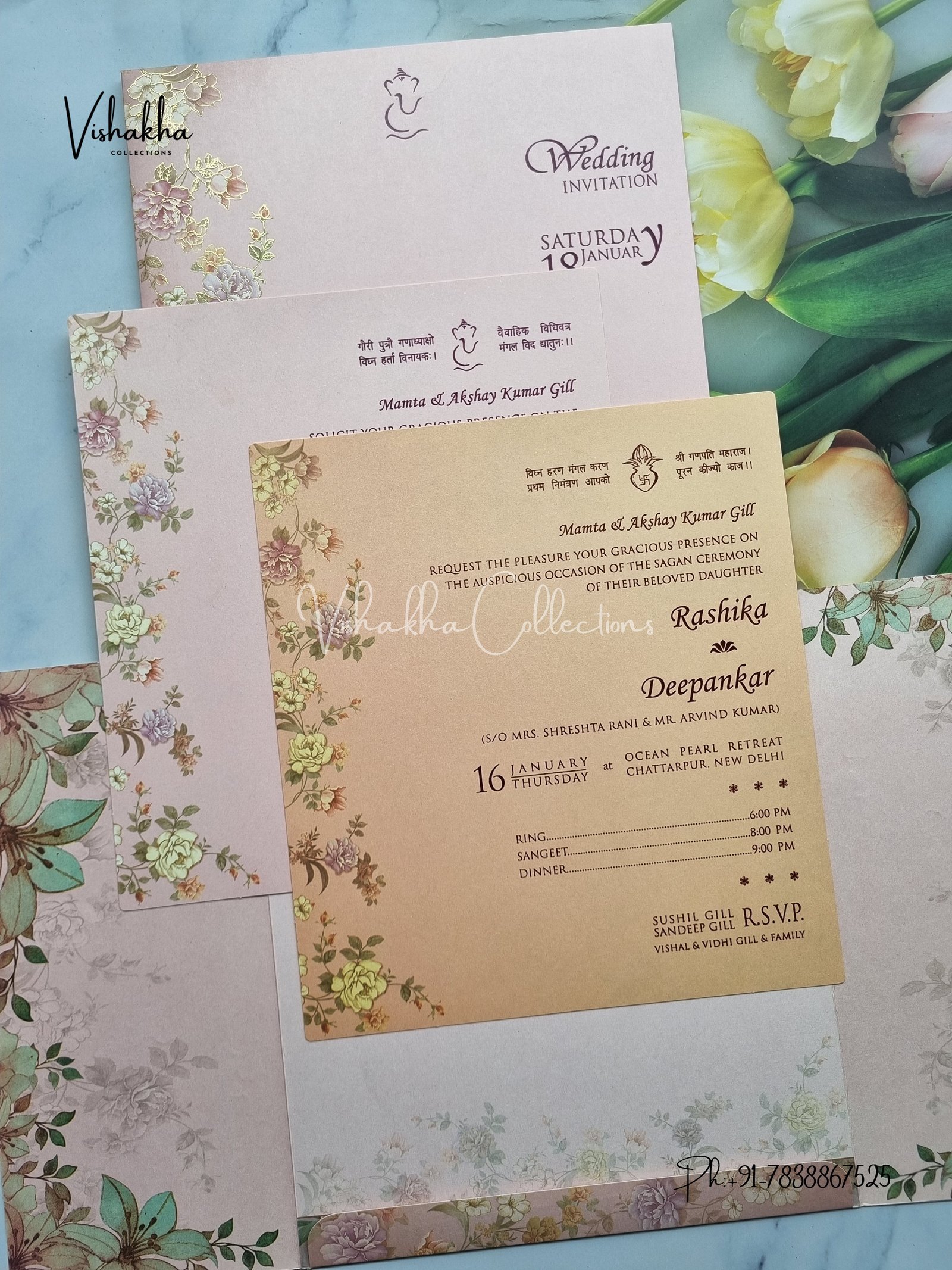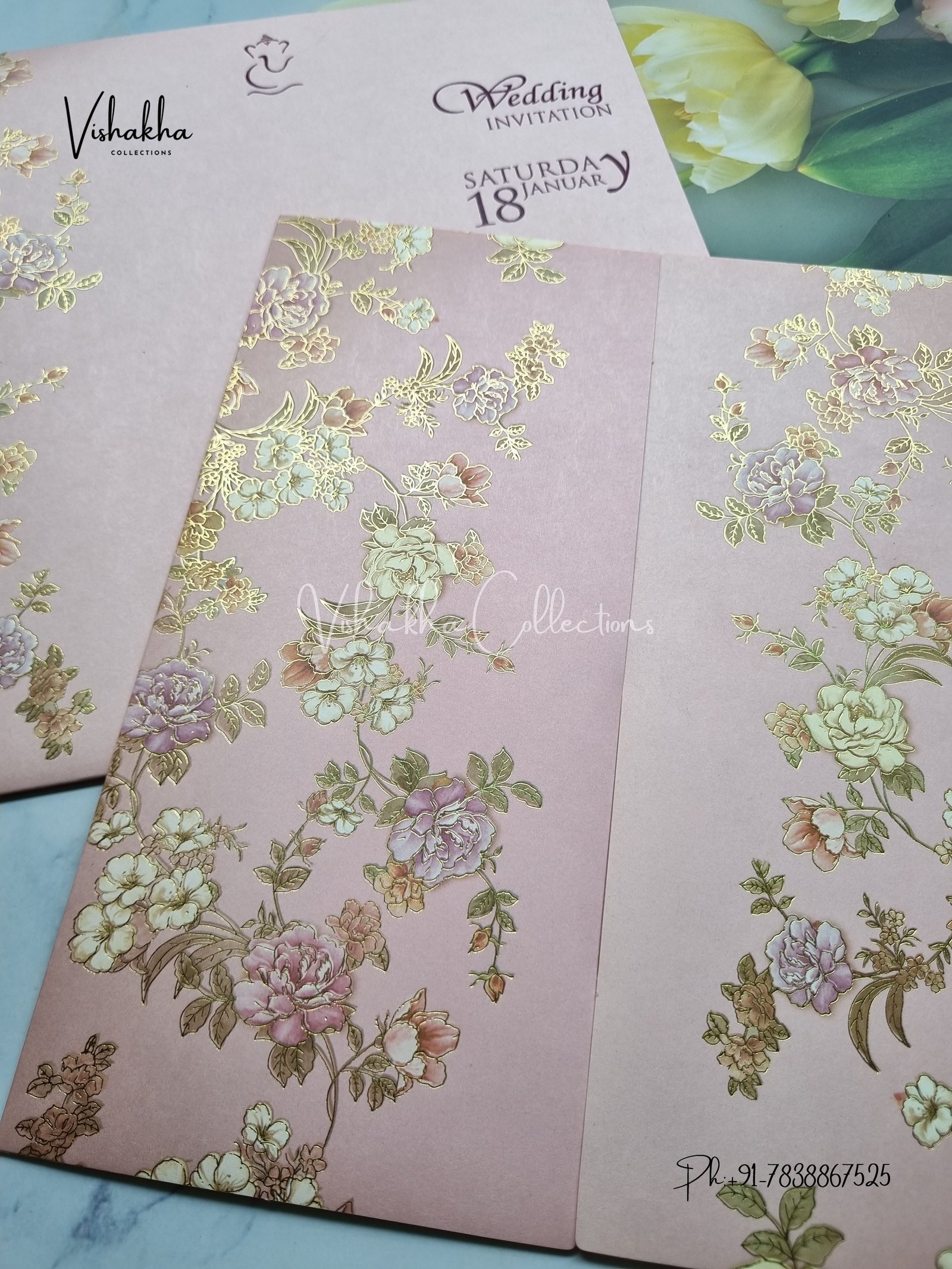 Vishakha Collections presents you beautiful luxury wedding invitation cards with all latest designs and the latest variety. Its just not a wedding invitation card but a beautiful feeling of love and relationship it carries for you. Beautifully printed and packed with a bundle of love. if you like it, dont think again, just go for it.If you are worrying about the quality of the product, send your doubts to us. We are here to help you. If you want in wholesale or bulk, dont forget to contact us.