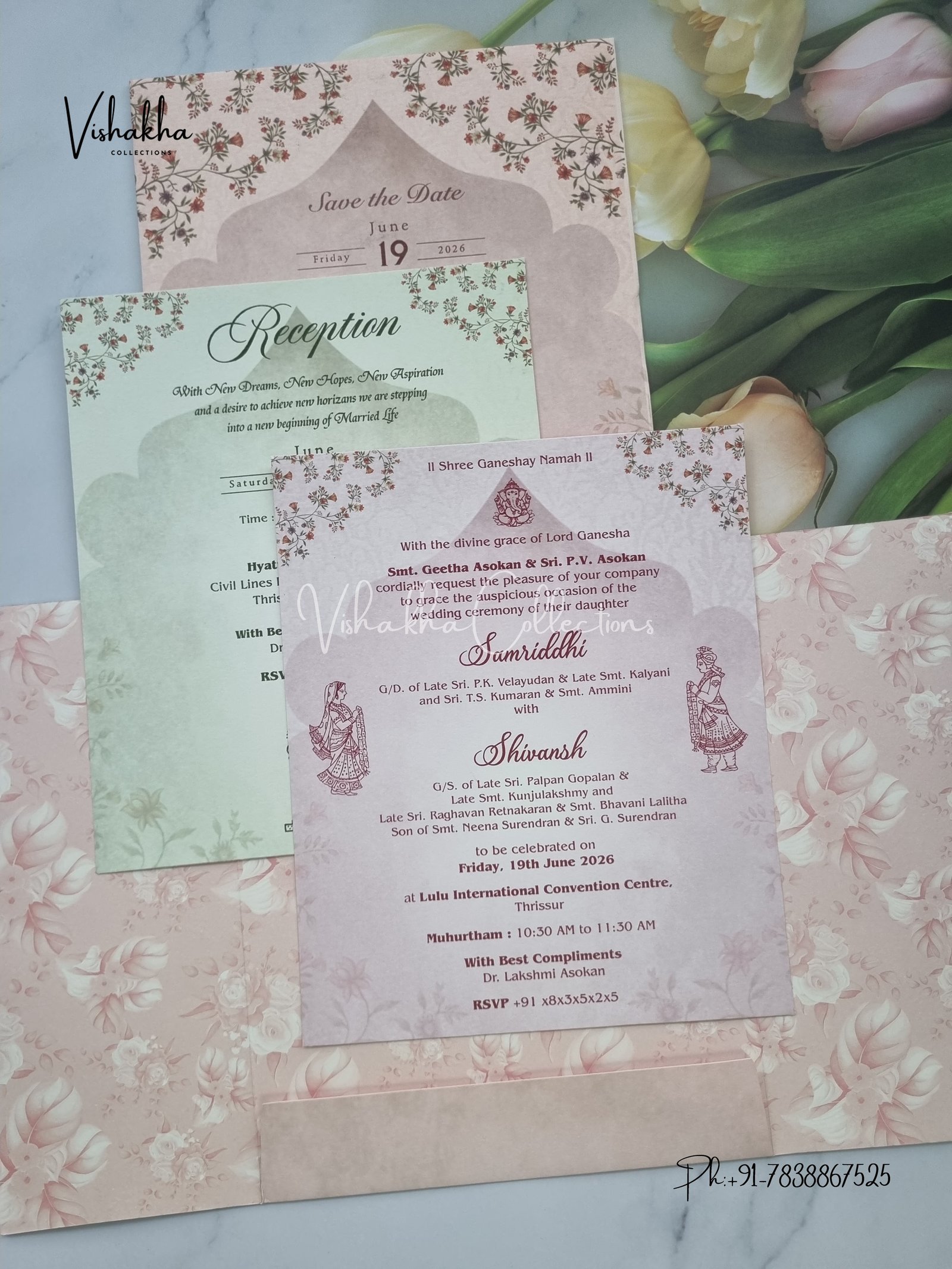 Vishakha Collections presents you beautiful luxury wedding invitation cards with all latest designs and the latest variety. Its just not a wedding invitation card but a beautiful feeling of love and relationship it carries for you. Beautifully printed and packed with a bundle of love. if you like it, dont think again, just go for it.If you are worrying about the quality of the product, send your doubts to us. We are here to help you. If you want in wholesale or bulk, dont forget to contact us.