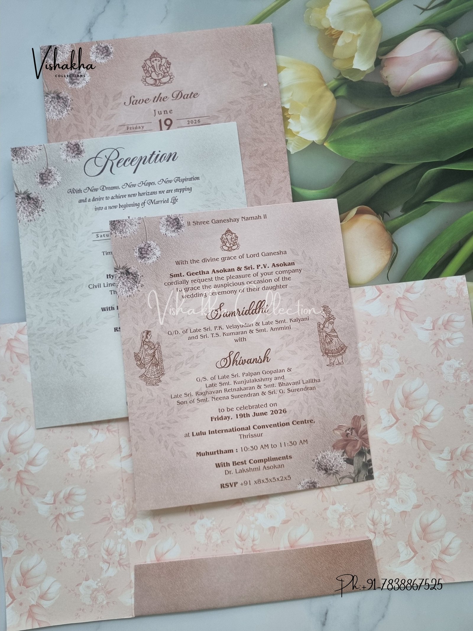 Vishakha Collections presents you beautiful luxury wedding invitation cards with all latest designs and the latest variety. Its just not a wedding invitation card but a beautiful feeling of love and relationship it carries for you. Beautifully printed and packed with a bundle of love. if you like it, dont think again, just go for it.If you are worrying about the quality of the product, send your doubts to us. We are here to help you. If you want in wholesale or bulk, dont forget to contact us.