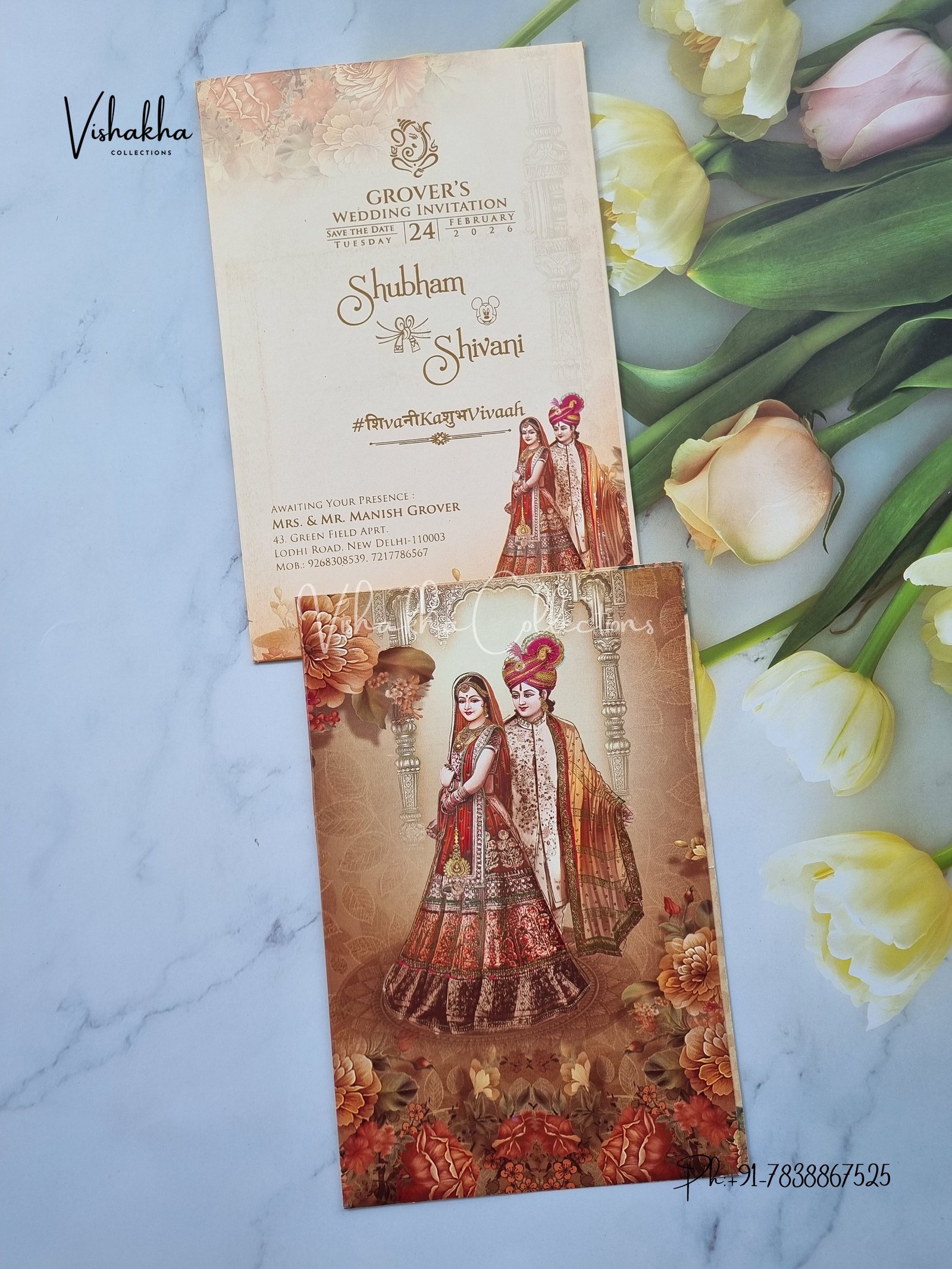 Vishakha Collections presents you beautiful luxury wedding invitation cards with all latest designs and the latest variety. Its just not a wedding invitation card but a beautiful feeling of love and relationship it carries for you. Beautifully printed and packed with a bundle of love. if you like it, dont think again, just go for it.If you are worrying about the quality of the product, send your doubts to us. We are here to help you. If you want in wholesale or bulk, dont forget to contact us.