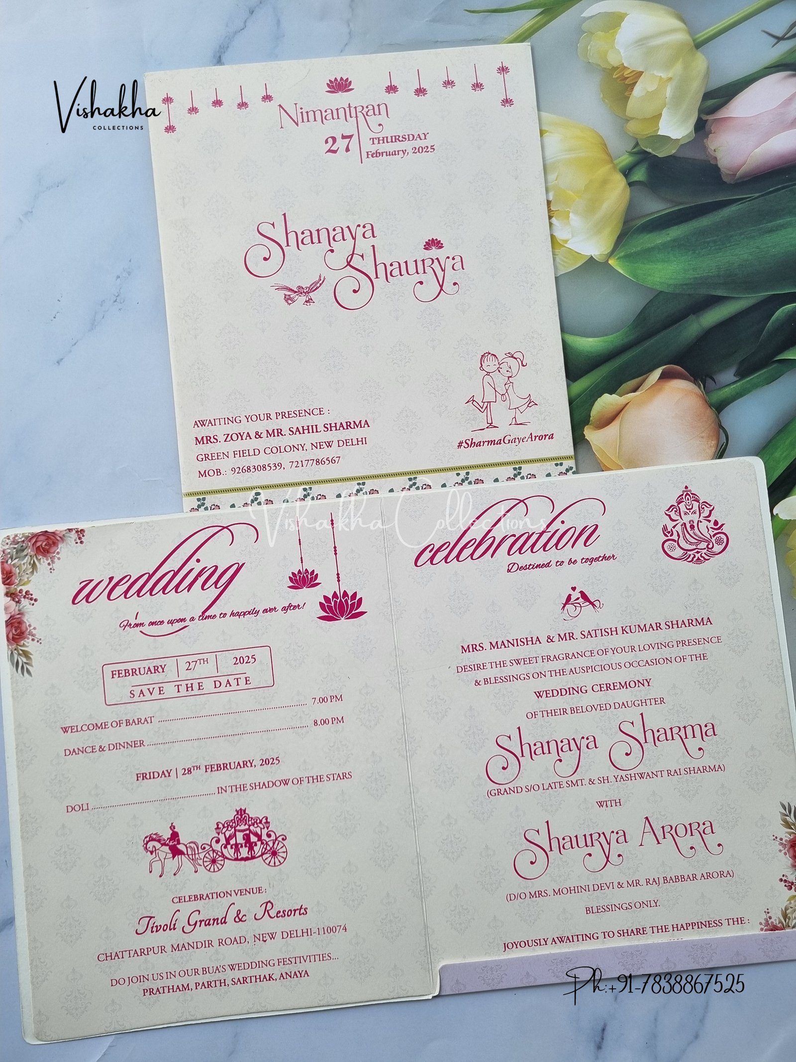 Vishakha Collections presents you beautiful luxury wedding invitation cards with all latest designs and the latest variety. Its just not a wedding invitation card but a beautiful feeling of love and relationship it carries for you. Beautifully printed and packed with a bundle of love. if you like it, dont think again, just go for it.If you are worrying about the quality of the product, send your doubts to us. We are here to help you. If you want in wholesale or bulk, dont forget to contact us.