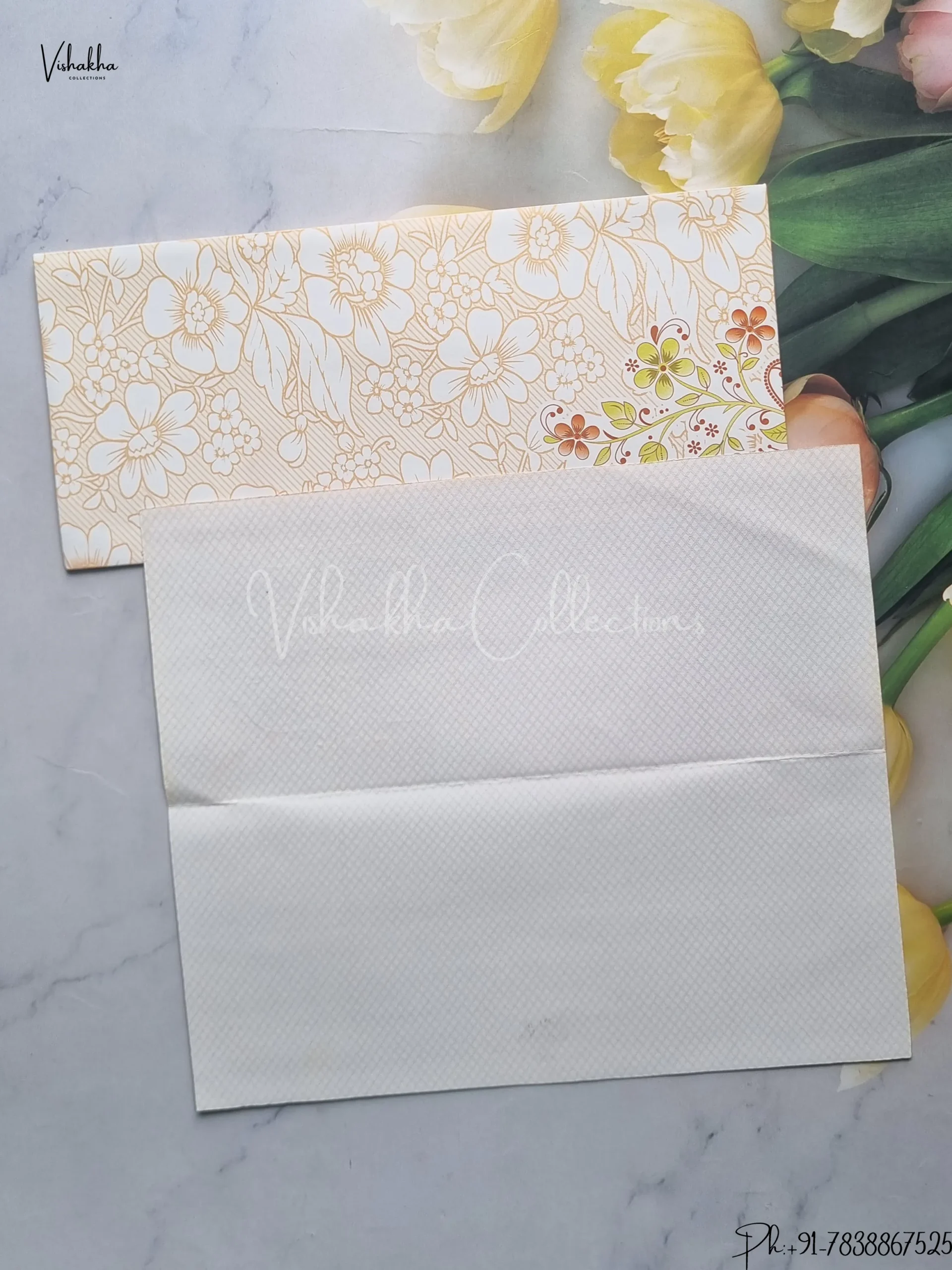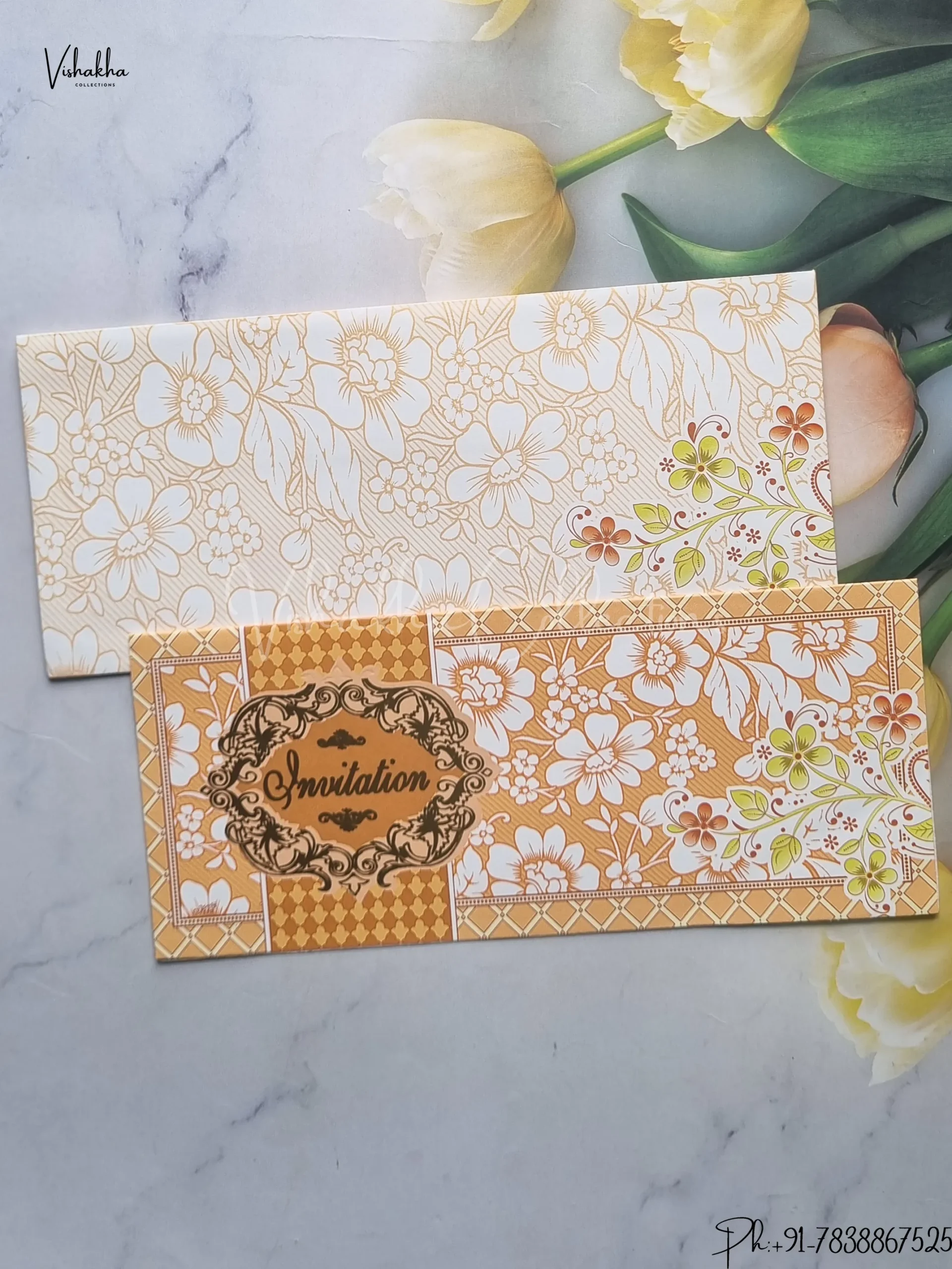 Vishakha Collections presents you beautiful luxury wedding invitation cards with all latest designs and the latest variety. Its just not a wedding invitation card but a beautiful feeling of love and relationship it carries for you. Beautifully printed and packed with a bundle of love. if you like it, dont think again, just go for it.If you are worrying about the quality of the product, send your doubts to us. We are here to help you. If you want in wholesale or bulk, dont forget to contact us.