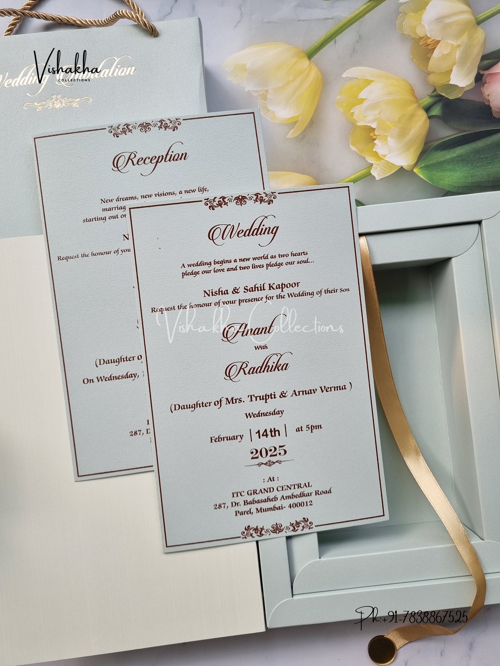 Vishakha Collections presents you beautiful luxury wedding invitation cards with all latest designs and the latest variety. Its just not a wedding invitation card but a beautiful feeling of love and relationship it carries for you. Beautifully printed and packed with a bundle of love. if you like it, dont think again, just go for it.If you are worrying about the quality of the product, send your doubts to us. We are here to help you. If you want in wholesale or bulk, dont forget to contact us.