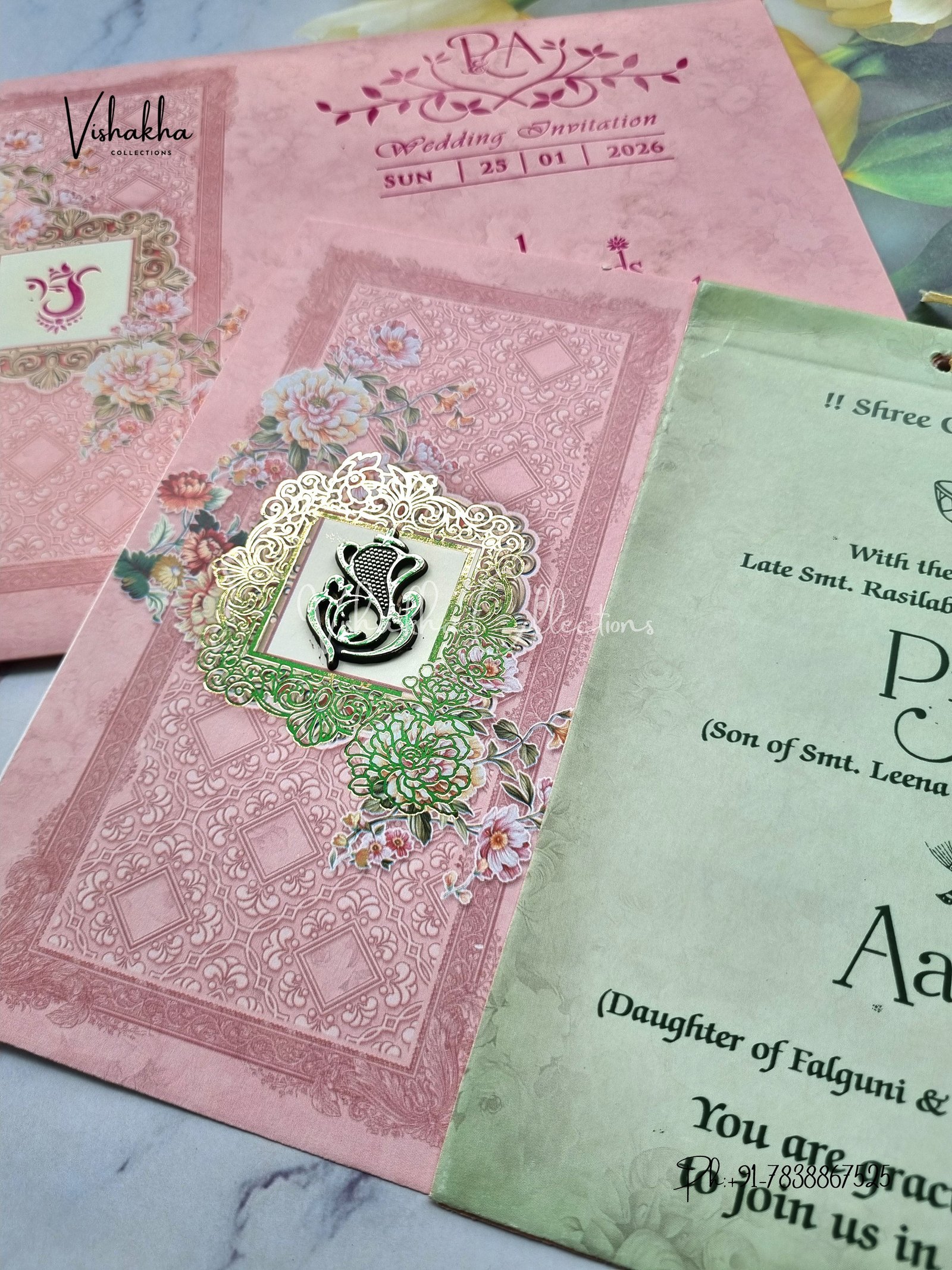 Vishakha Collections presents you beautiful luxury wedding invitation cards with all latest designs and the latest variety. Its just not a wedding invitation card but a beautiful feeling of love and relationship it carries for you. Beautifully printed and packed with a bundle of love. if you like it, dont think again, just go for it.If you are worrying about the quality of the product, send your doubts to us. We are here to help you. If you want in wholesale or bulk, dont forget to contact us.