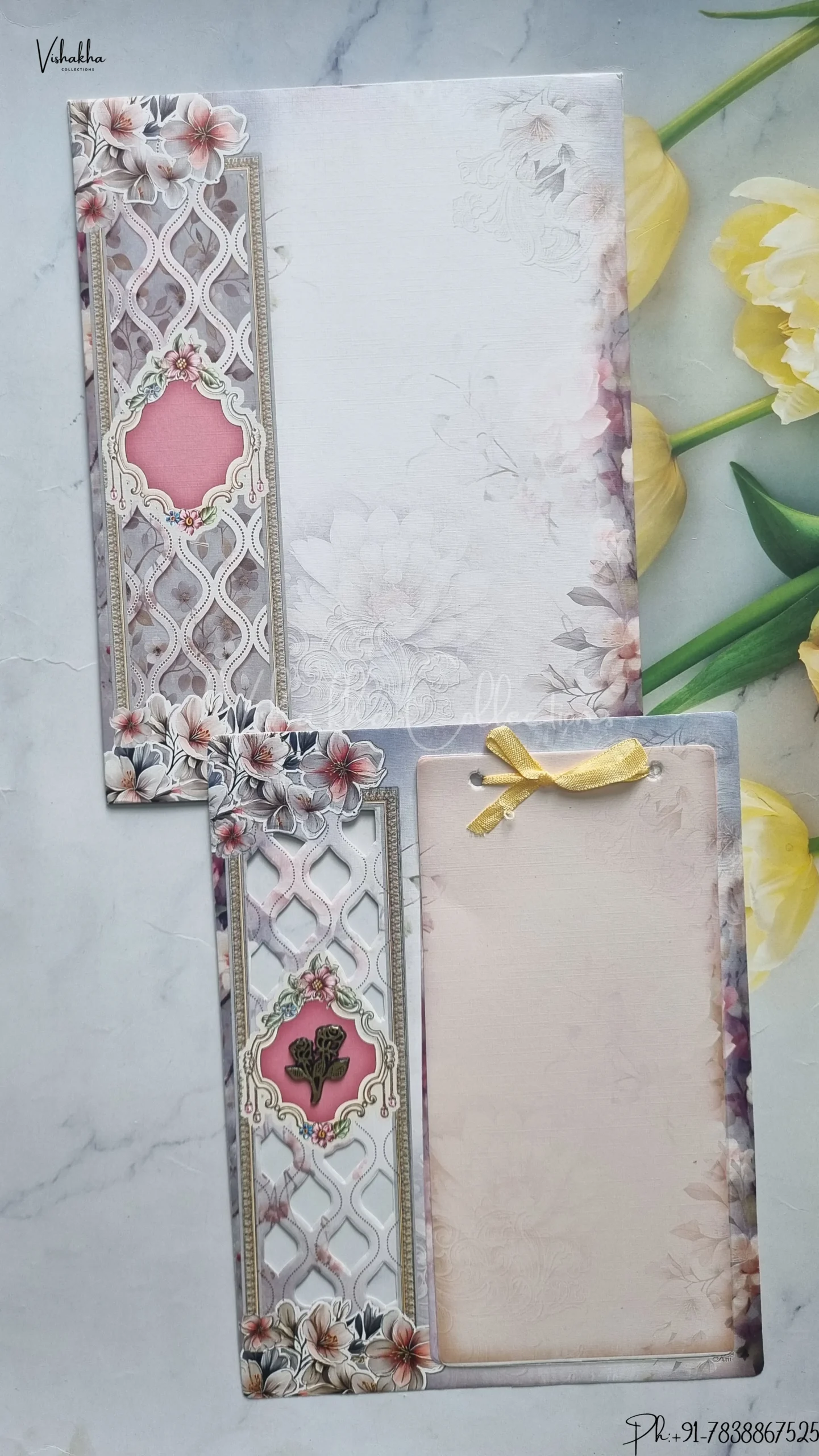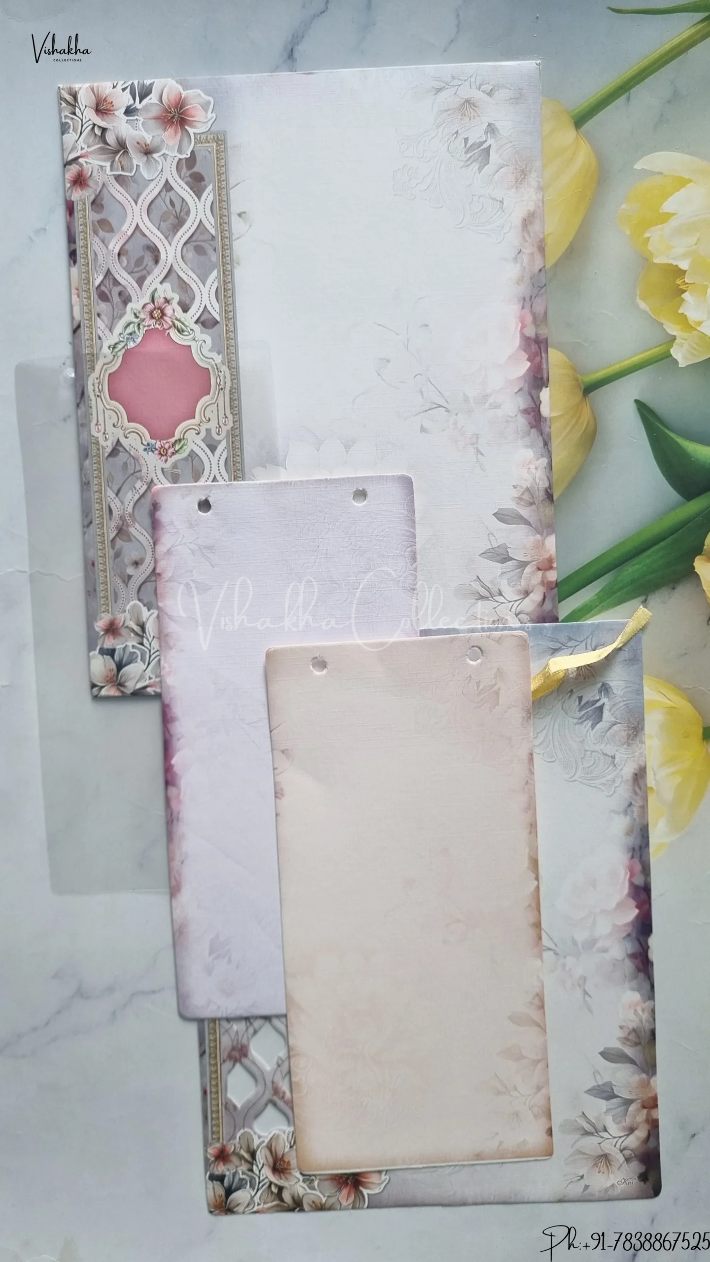 Vishakha Collections presents you beautiful luxury wedding invitation cards with all latest designs and the latest variety. Its just not a wedding invitation card but a beautiful feeling of love and relationship it carries for you. Beautifully printed and packed with a bundle of love. if you like it, dont think again, just go for it.If you are worrying about the quality of the product, send your doubts to us. We are here to help you. If you want in wholesale or bulk, dont forget to contact us.