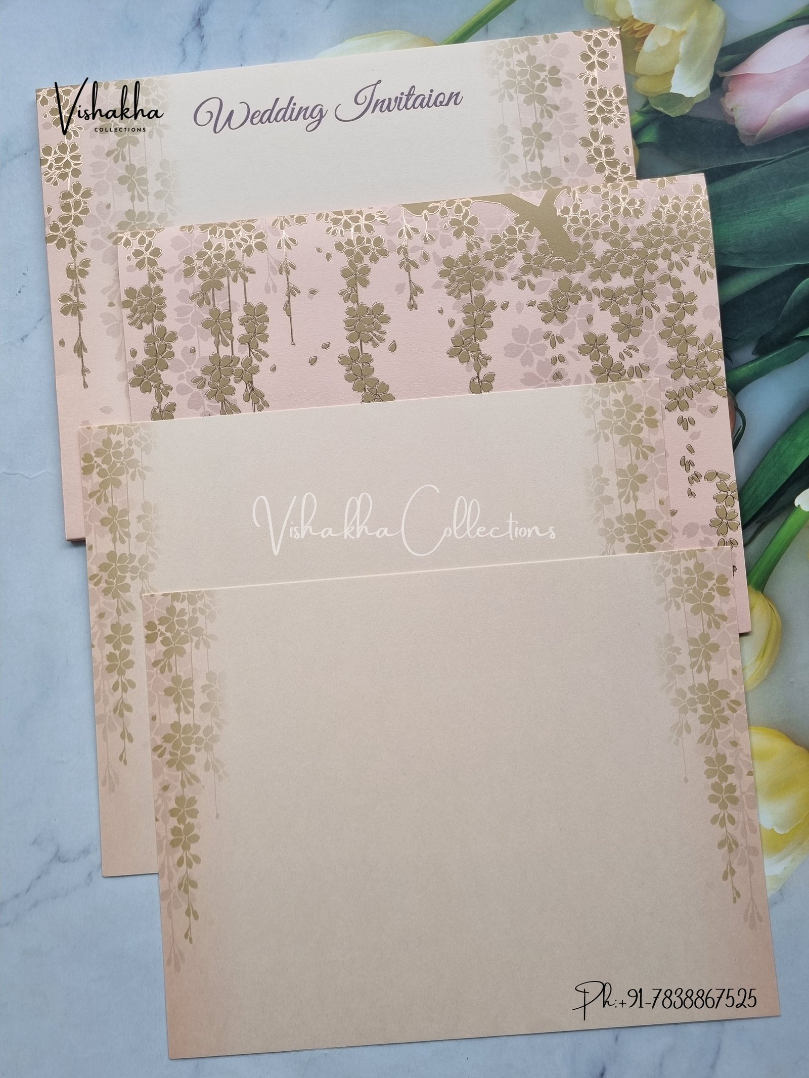 Vishakha Collections presents you beautiful luxury wedding invitation cards with all latest designs and the latest variety. Its just not a wedding invitation card but a beautiful feeling of love and relationship it carries for you. Beautifully printed and packed with a bundle of love. if you like it, dont think again, just go for it.If you are worrying about the quality of the product, send your doubts to us. We are here to help you. If you want in wholesale or bulk, dont forget to contact us.