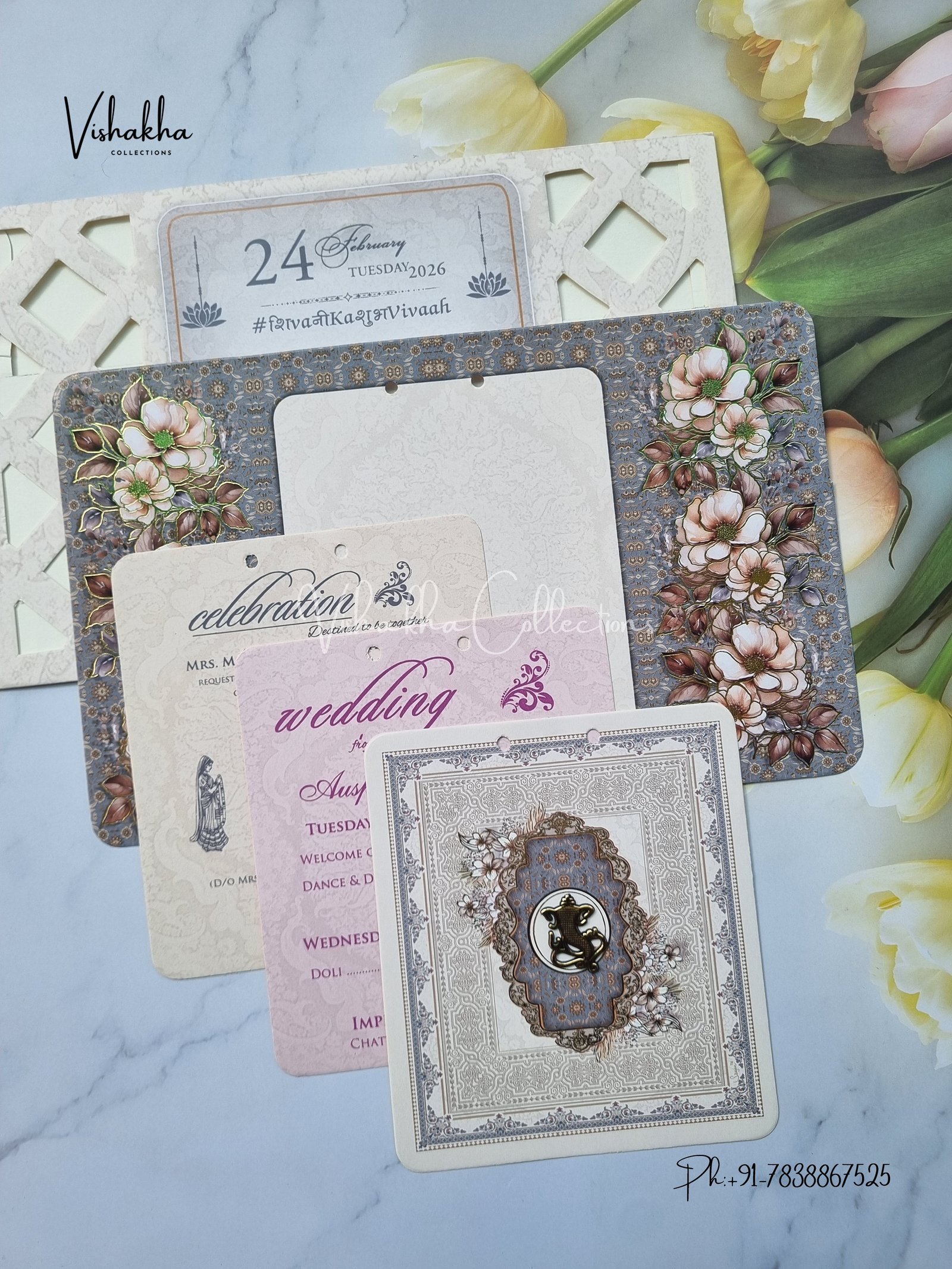 Vishakha Collections presents you beautiful luxury wedding invitation cards with all latest designs and the latest variety. Its just not a wedding invitation card but a beautiful feeling of love and relationship it carries for you. Beautifully printed and packed with a bundle of love. if you like it, dont think again, just go for it.If you are worrying about the quality of the product, send your doubts to us. We are here to help you. If you want in wholesale or bulk, dont forget to contact us.