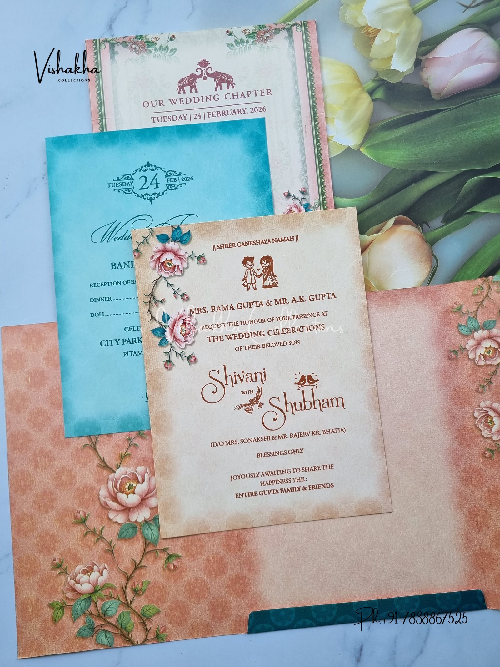 Vishakha Collections presents you beautiful luxury wedding invitation cards with all latest designs and the latest variety. Its just not a wedding invitation card but a beautiful feeling of love and relationship it carries for you. Beautifully printed and packed with a bundle of love. if you like it, dont think again, just go for it.If you are worrying about the quality of the product, send your doubts to us. We are here to help you. If you want in wholesale or bulk, dont forget to contact us.