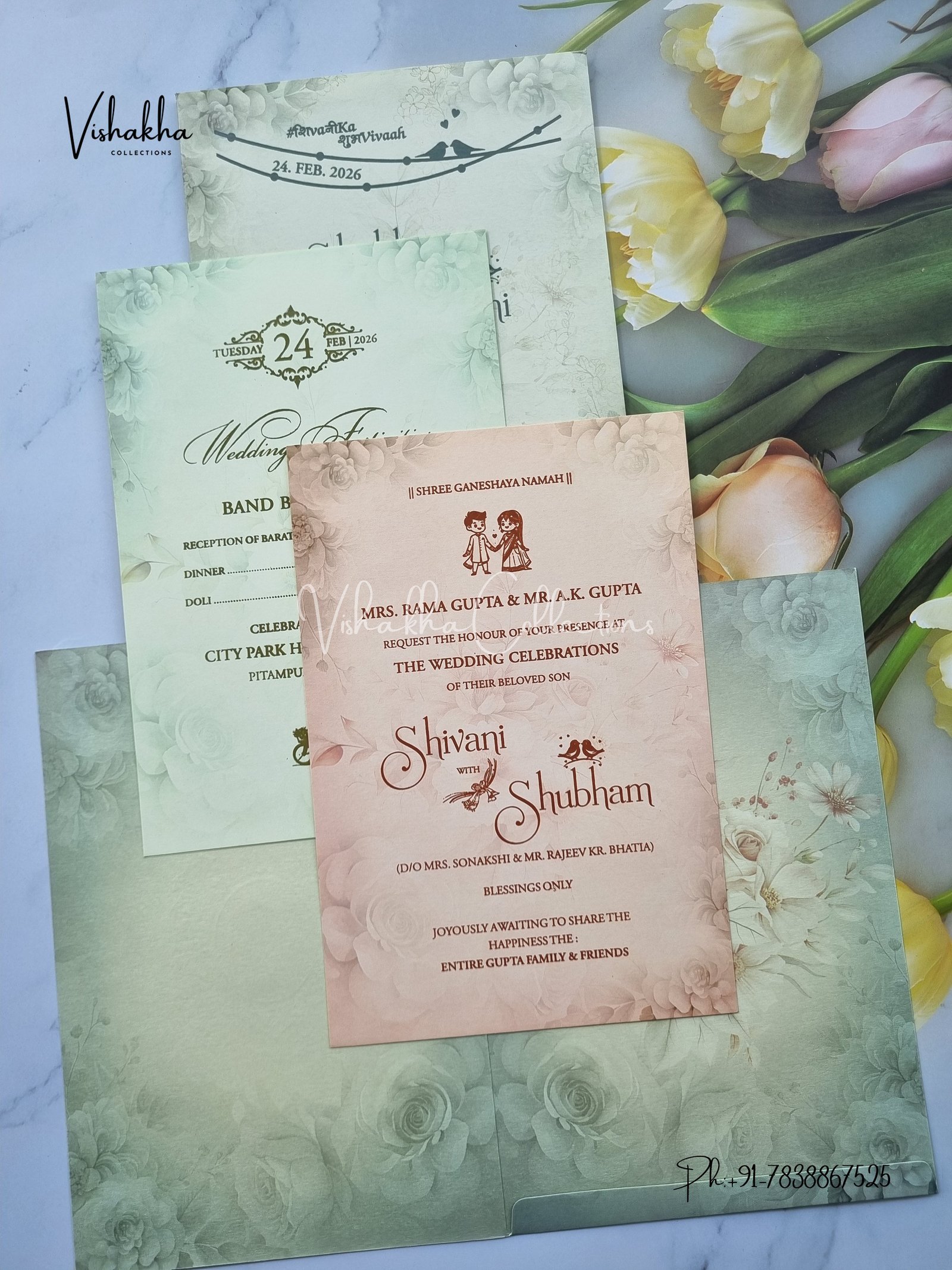 Vishakha Collections presents you beautiful luxury wedding invitation cards with all latest designs and the latest variety. Its just not a wedding invitation card but a beautiful feeling of love and relationship it carries for you. Beautifully printed and packed with a bundle of love. if you like it, dont think again, just go for it.If you are worrying about the quality of the product, send your doubts to us. We are here to help you. If you want in wholesale or bulk, dont forget to contact us.