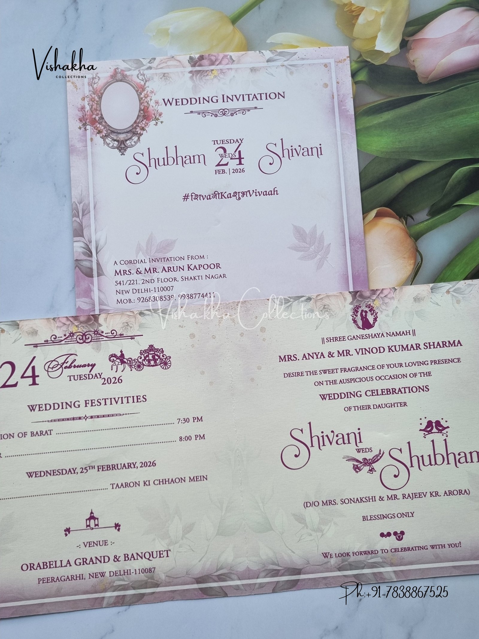 Vishakha Collections presents you beautiful luxury wedding invitation cards with all latest designs and the latest variety. Its just not a wedding invitation card but a beautiful feeling of love and relationship it carries for you. Beautifully printed and packed with a bundle of love. if you like it, dont think again, just go for it.If you are worrying about the quality of the product, send your doubts to us. We are here to help you. If you want in wholesale or bulk, dont forget to contact us.