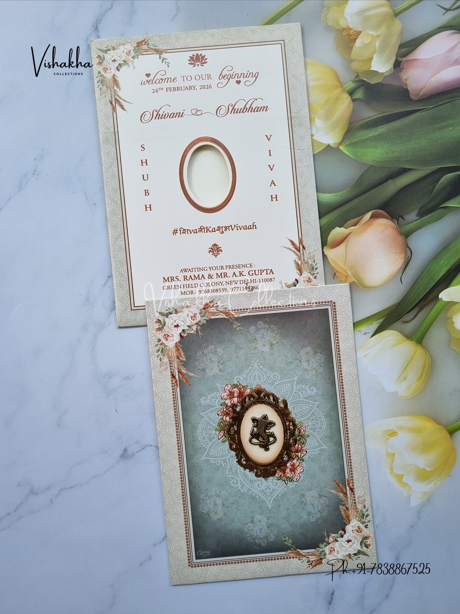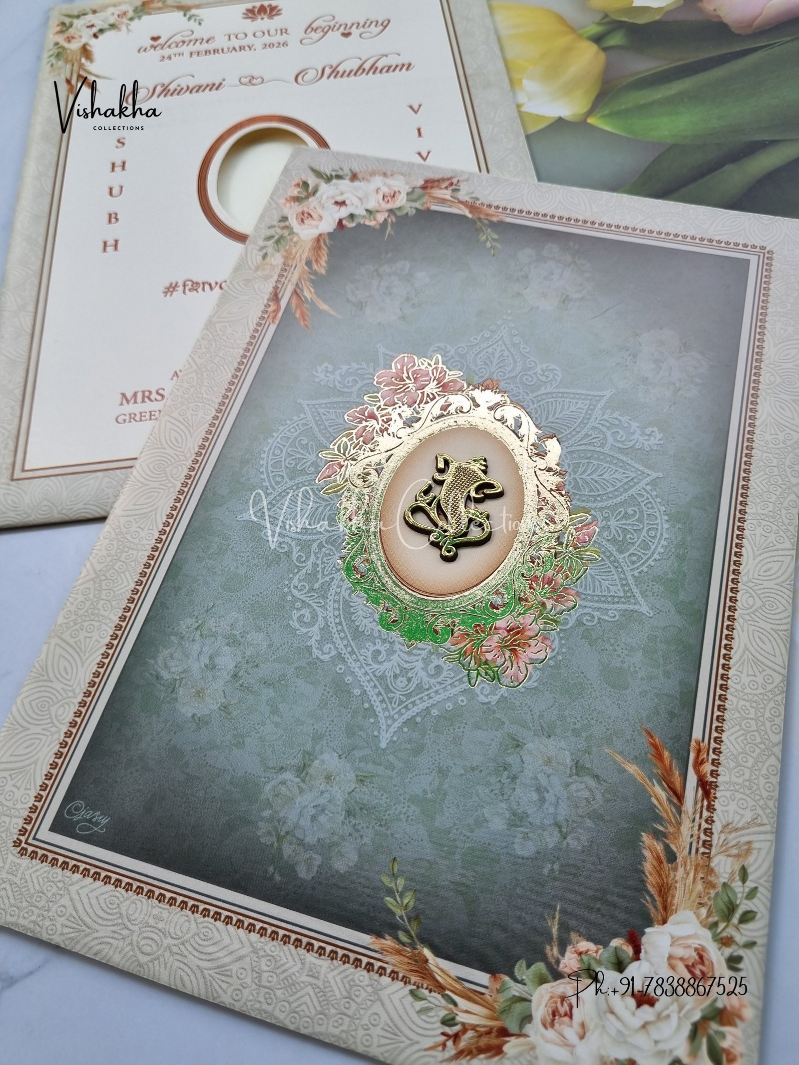 Vishakha Collections presents you beautiful luxury wedding invitation cards with all latest designs and the latest variety. Its just not a wedding invitation card but a beautiful feeling of love and relationship it carries for you. Beautifully printed and packed with a bundle of love. if you like it, dont think again, just go for it.If you are worrying about the quality of the product, send your doubts to us. We are here to help you. If you want in wholesale or bulk, dont forget to contact us.