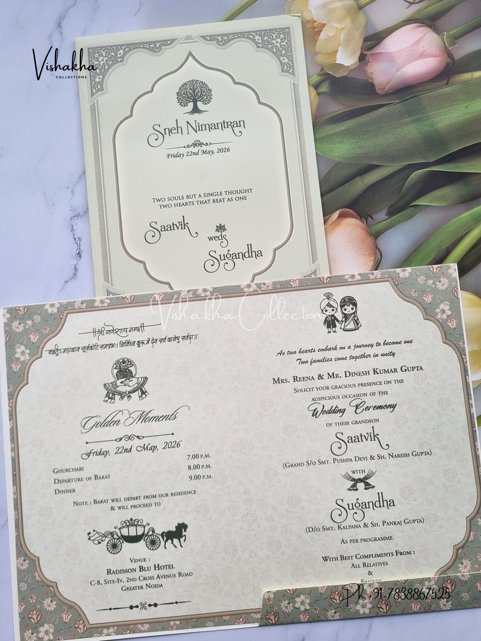 Vishakha Collections presents you beautiful luxury wedding invitation cards with all latest designs and the latest variety. Its just not a wedding invitation card but a beautiful feeling of love and relationship it carries for you. Beautifully printed and packed with a bundle of love. if you like it, dont think again, just go for it.If you are worrying about the quality of the product, send your doubts to us. We are here to help you. If you want in wholesale or bulk, dont forget to contact us.