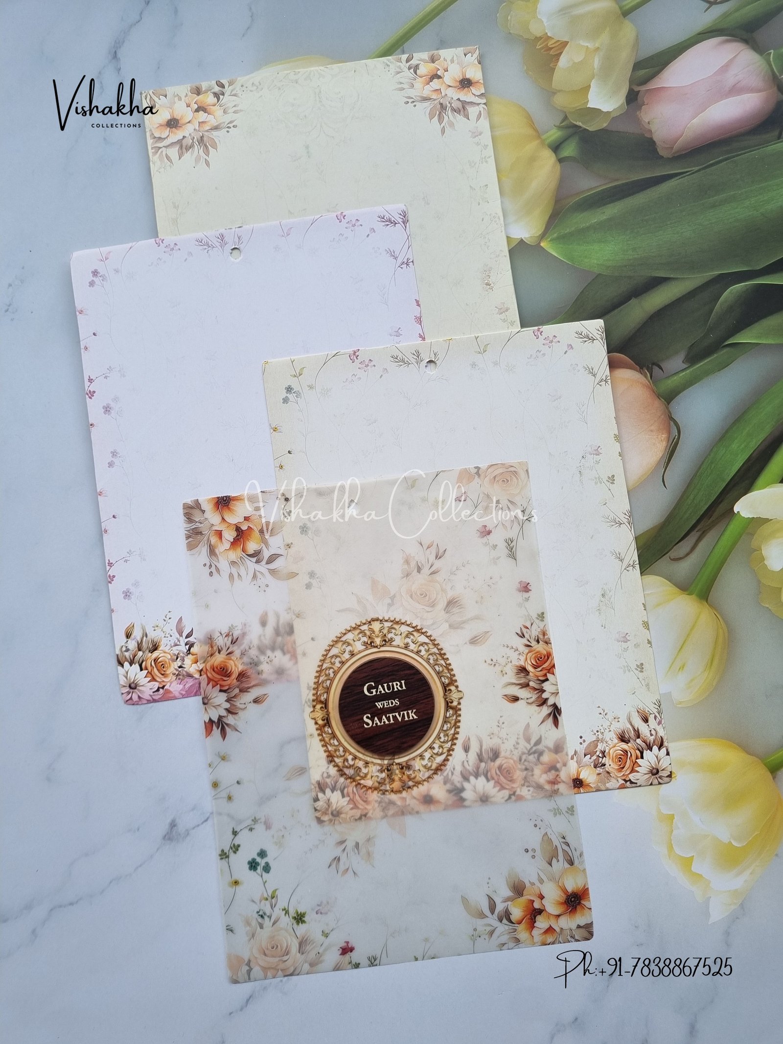 Vishakha Collections presents you beautiful luxury wedding invitation cards with all latest designs and the latest variety. Its just not a wedding invitation card but a beautiful feeling of love and relationship it carries for you. Beautifully printed and packed with a bundle of love. if you like it, dont think again, just go for it.If you are worrying about the quality of the product, send your doubts to us. We are here to help you. If you want in wholesale or bulk, dont forget to contact us.