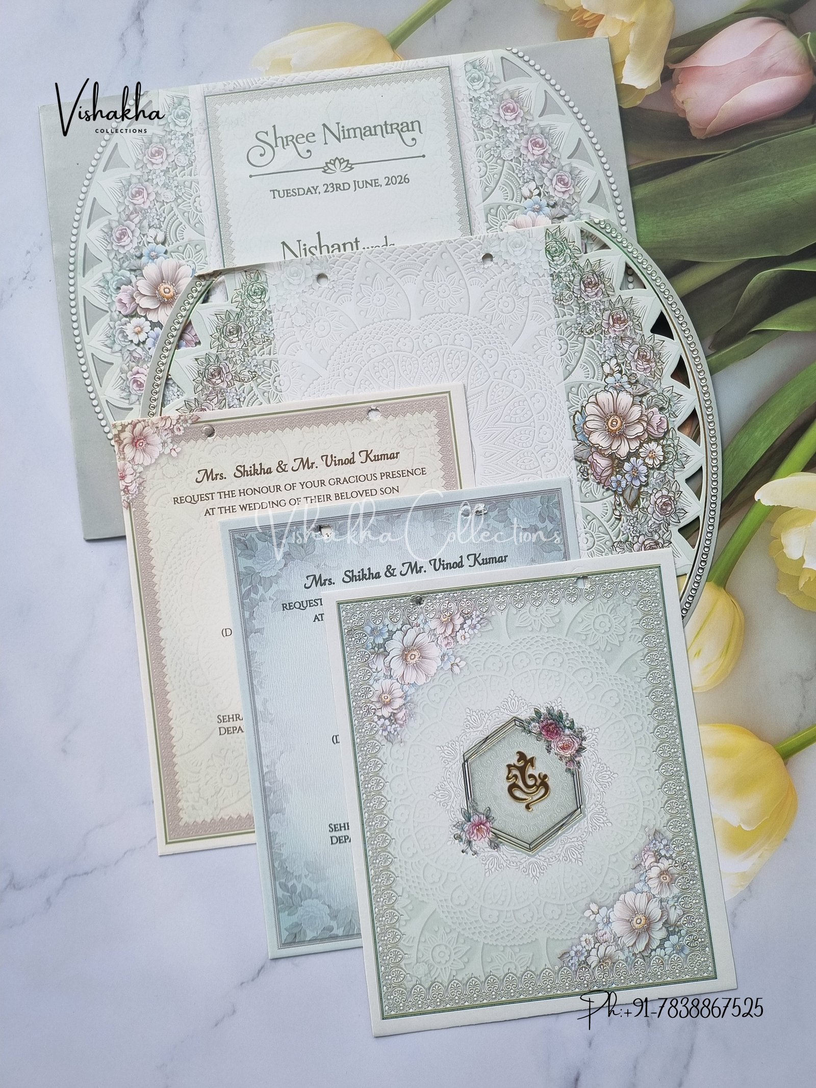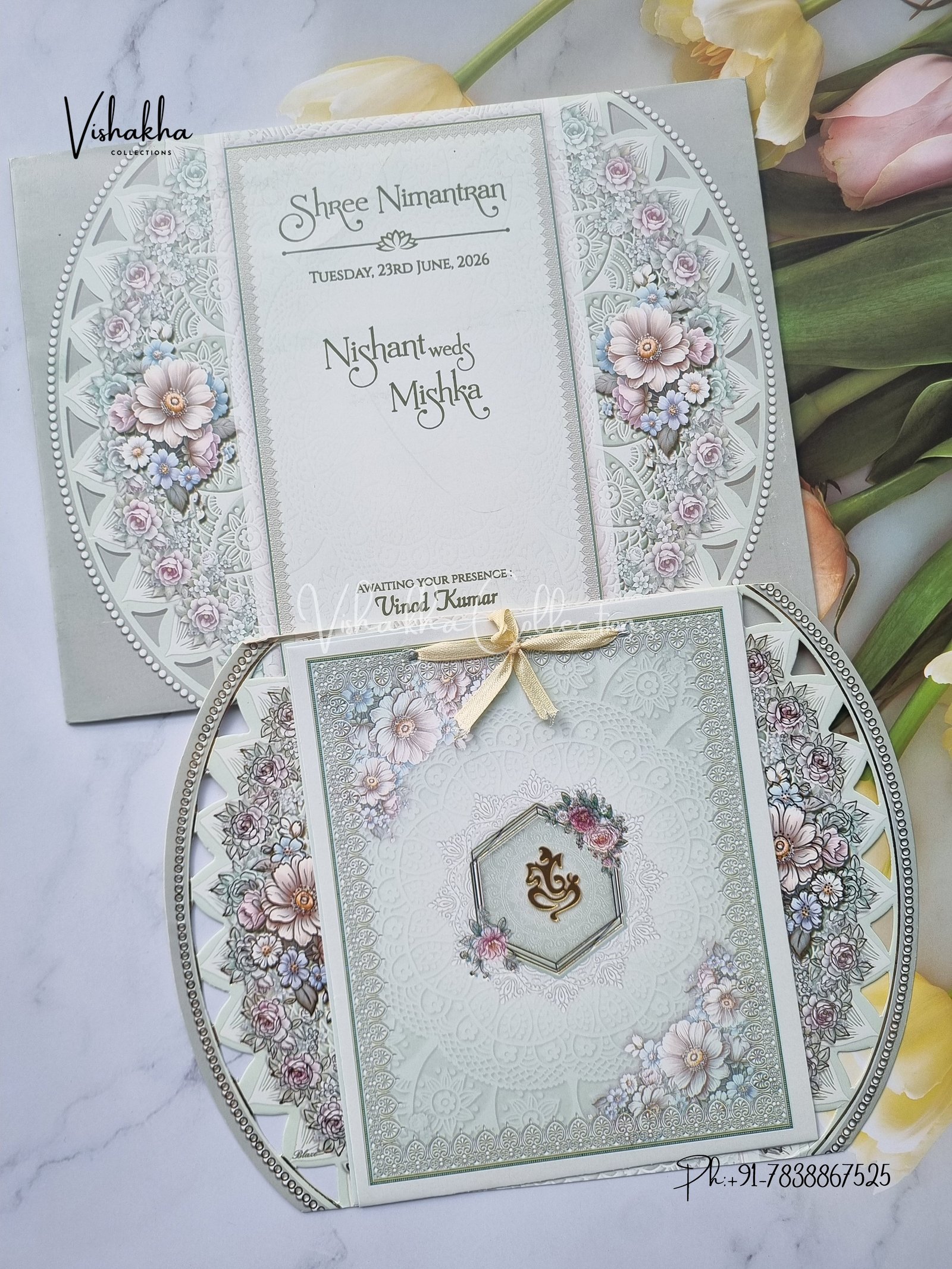 Vishakha Collections presents you beautiful luxury wedding invitation cards with all latest designs and the latest variety. Its just not a wedding invitation card but a beautiful feeling of love and relationship it carries for you. Beautifully printed and packed with a bundle of love. if you like it, dont think again, just go for it.If you are worrying about the quality of the product, send your doubts to us. We are here to help you. If you want in wholesale or bulk, dont forget to contact us.