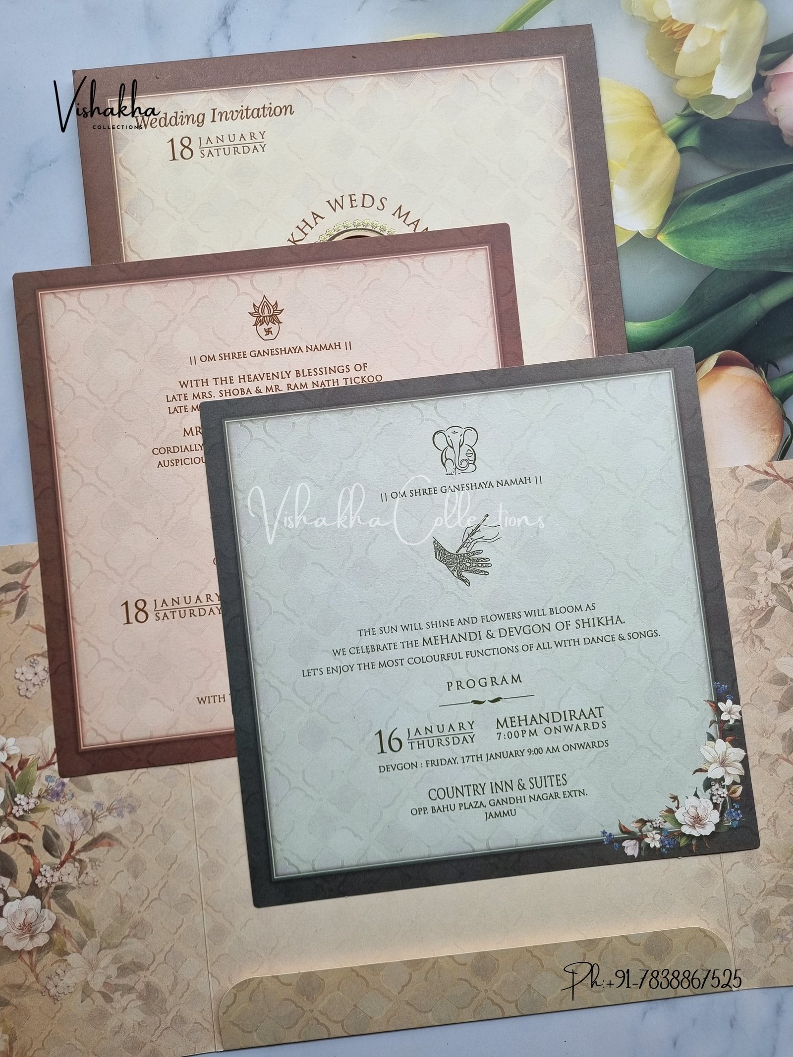 Vishakha Collections presents you beautiful luxury wedding invitation cards with all latest designs and the latest variety. Its just not a wedding invitation card but a beautiful feeling of love and relationship it carries for you. Beautifully printed and packed with a bundle of love. if you like it, dont think again, just go for it.If you are worrying about the quality of the product, send your doubts to us. We are here to help you. If you want in wholesale or bulk, dont forget to contact us.