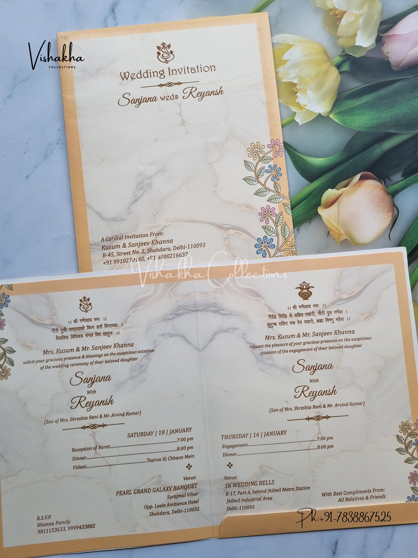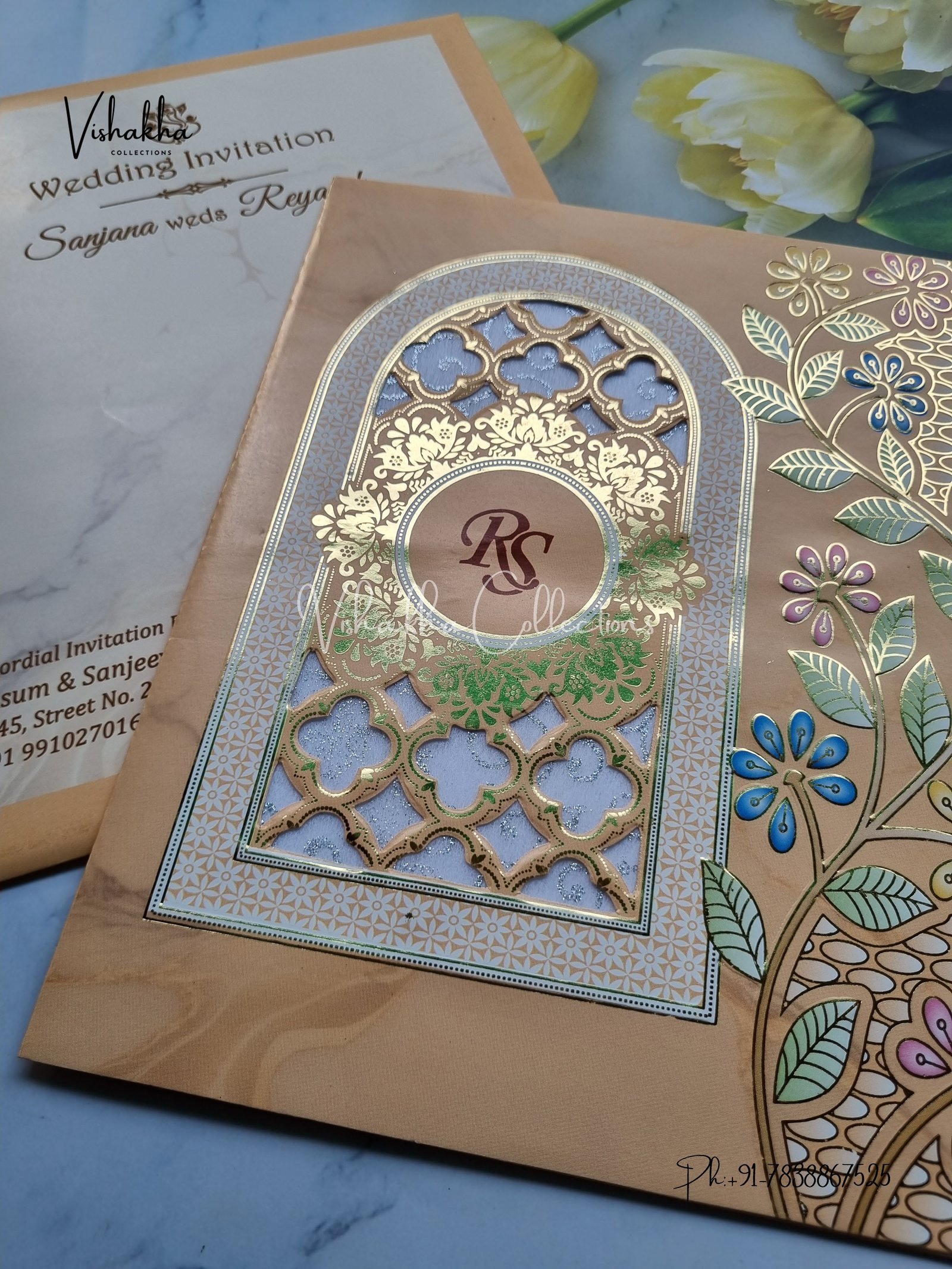 Vishakha Collections presents you beautiful luxury wedding invitation cards with all latest designs and the latest variety. Its just not a wedding invitation card but a beautiful feeling of love and relationship it carries for you. Beautifully printed and packed with a bundle of love. if you like it, dont think again, just go for it.If you are worrying about the quality of the product, send your doubts to us. We are here to help you. If you want in wholesale or bulk, dont forget to contact us.