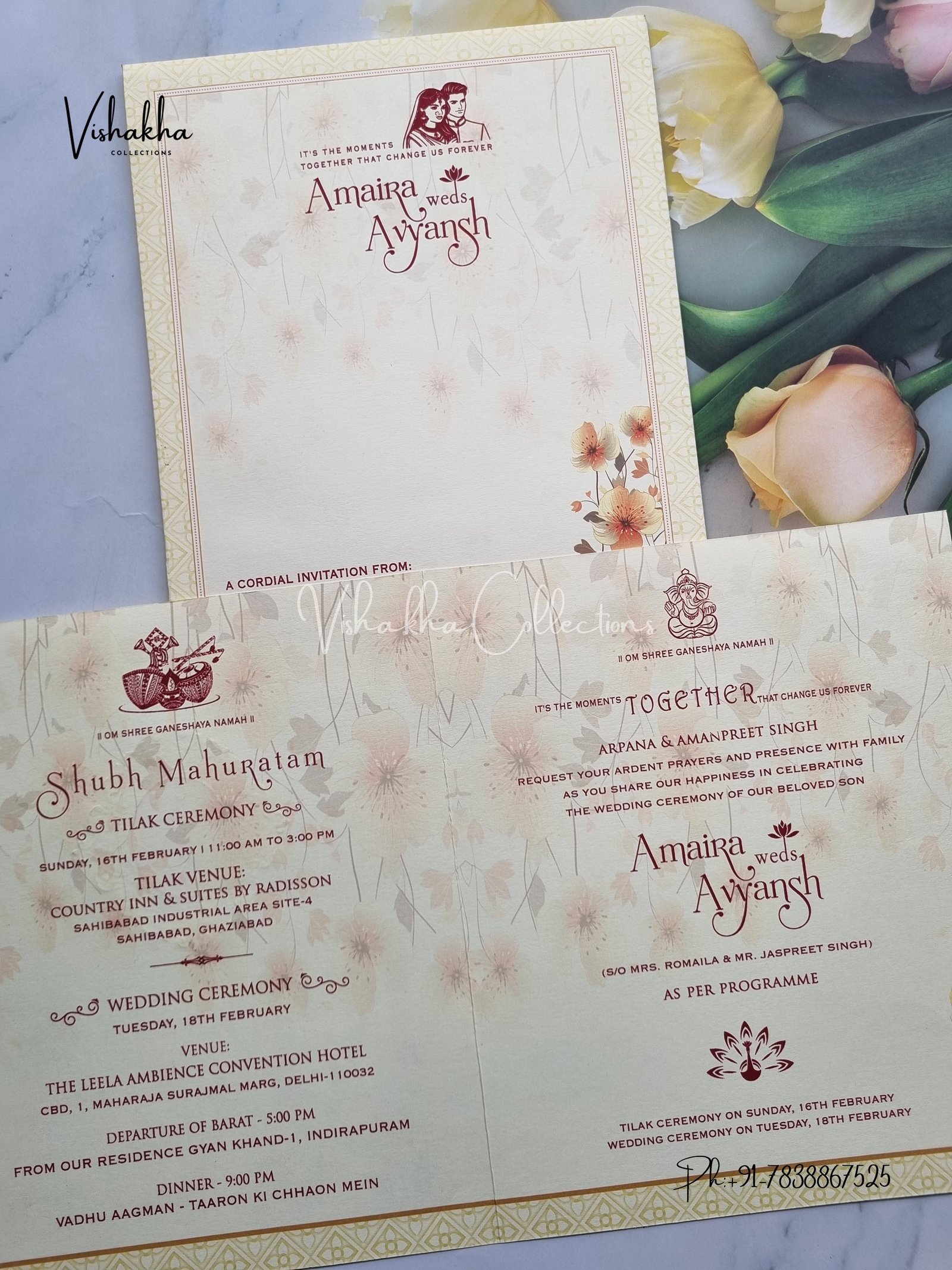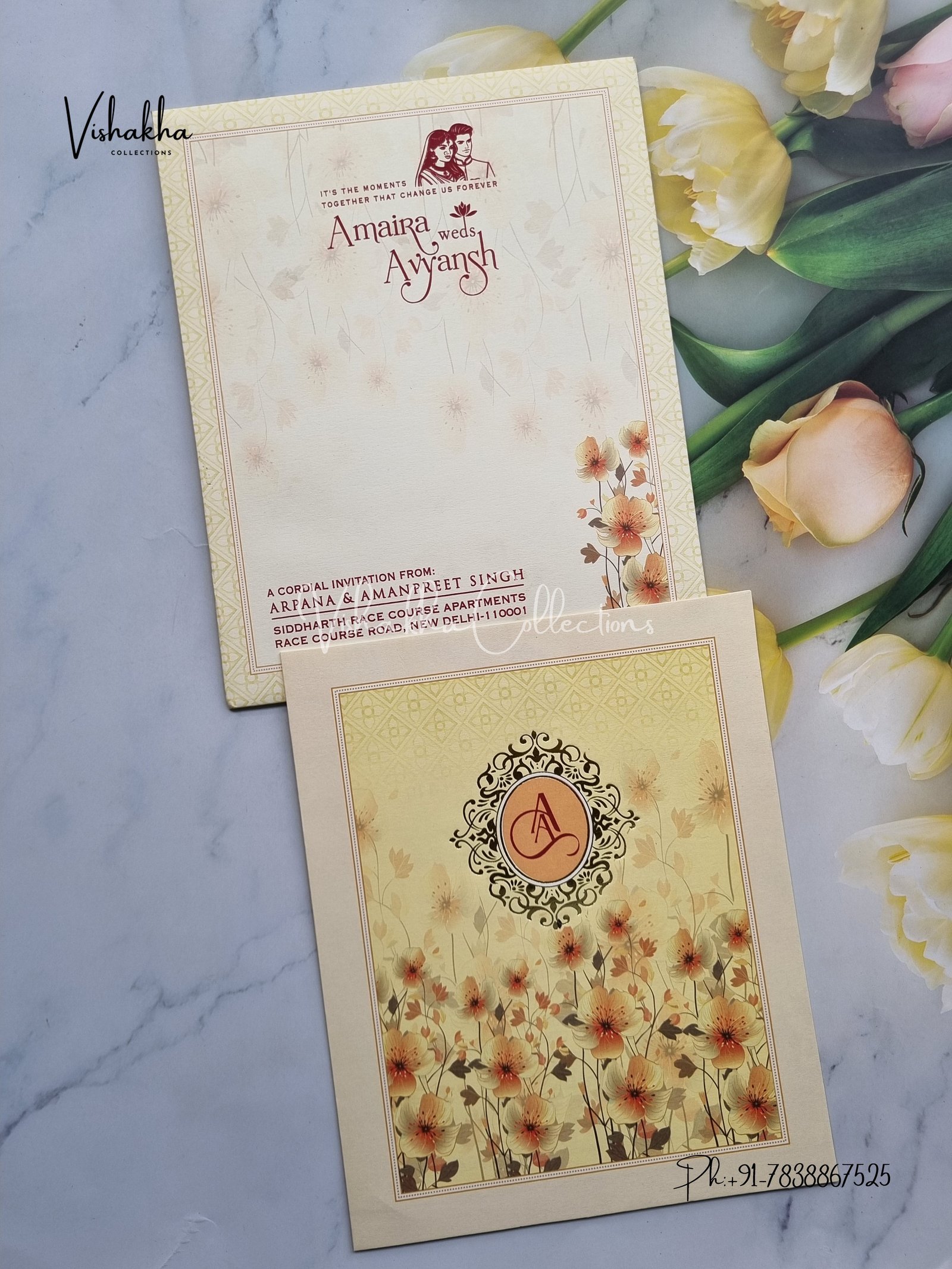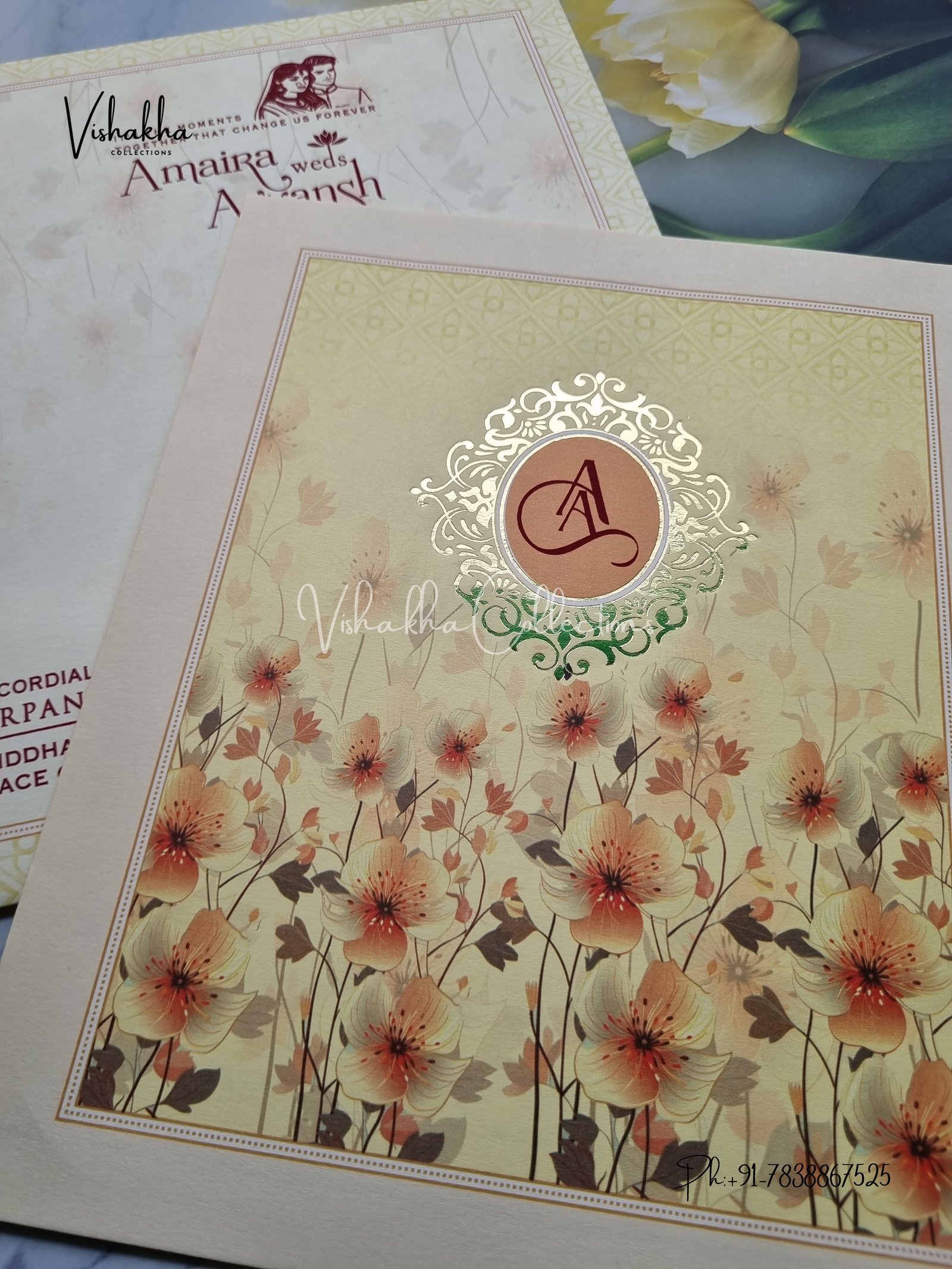 Vishakha Collections presents you beautiful luxury wedding invitation cards with all latest designs and the latest variety. Its just not a wedding invitation card but a beautiful feeling of love and relationship it carries for you. Beautifully printed and packed with a bundle of love. if you like it, dont think again, just go for it.If you are worrying about the quality of the product, send your doubts to us. We are here to help you. If you want in wholesale or bulk, dont forget to contact us.