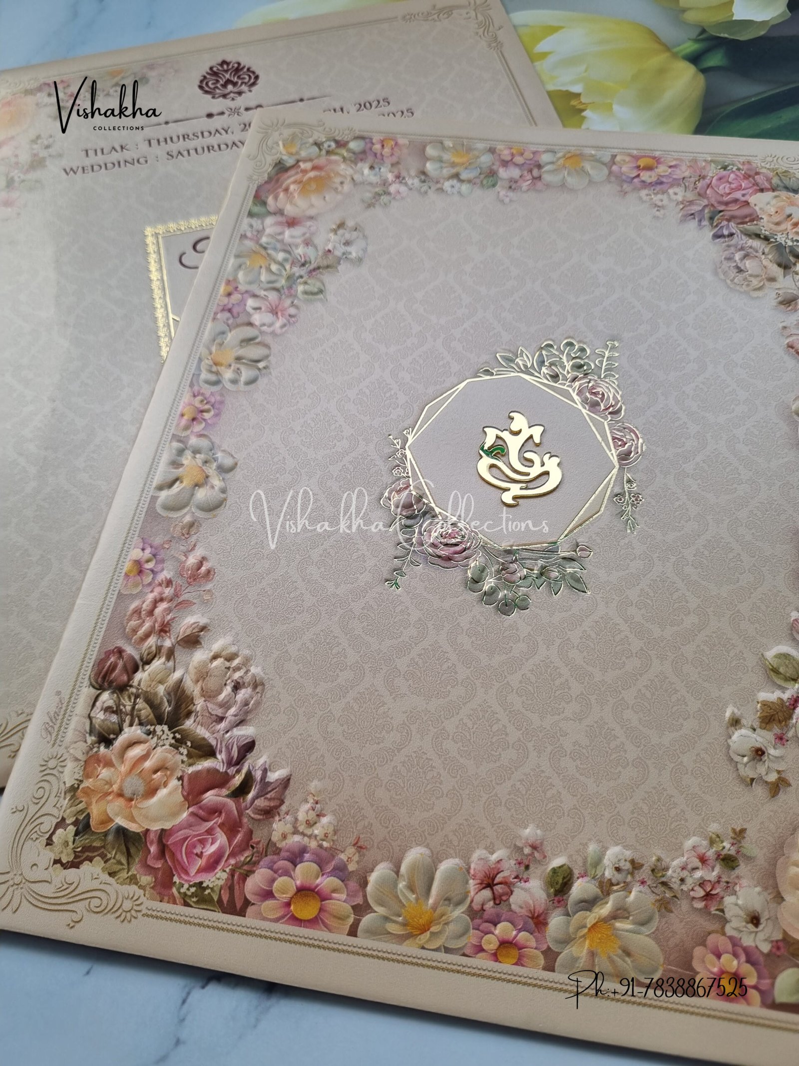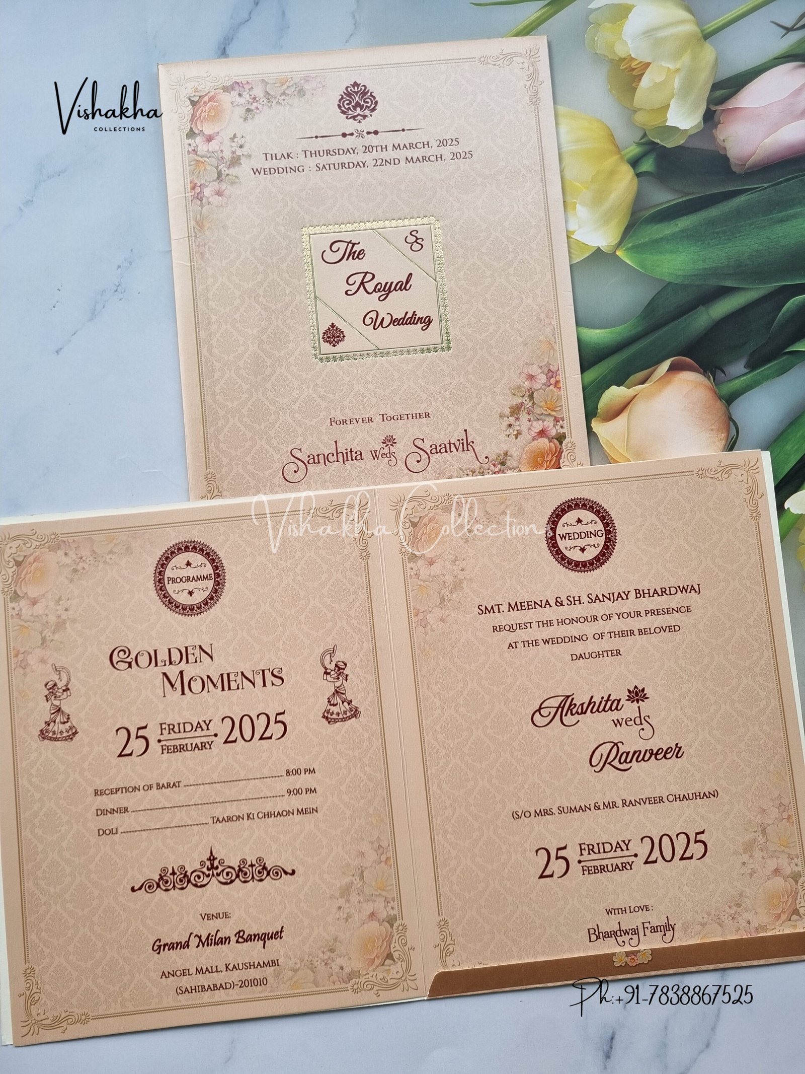 Vishakha Collections presents you beautiful luxury wedding invitation cards with all latest designs and the latest variety. Its just not a wedding invitation card but a beautiful feeling of love and relationship it carries for you. Beautifully printed and packed with a bundle of love. if you like it, dont think again, just go for it.If you are worrying about the quality of the product, send your doubts to us. We are here to help you. If you want in wholesale or bulk, dont forget to contact us.